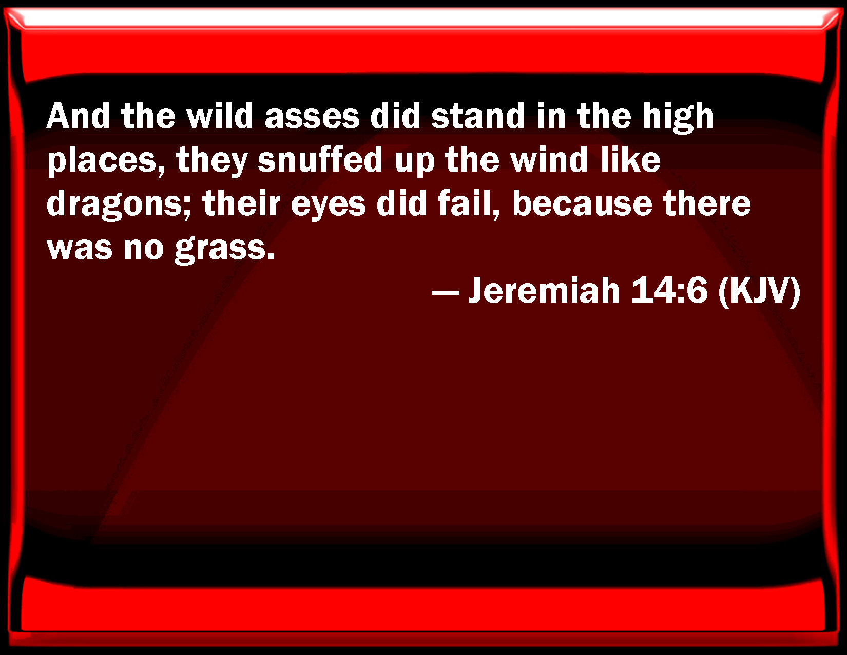 Bible Verse Slide Jeremiah 14:6 And the wild asses did stand in the high places, they snuffed up the wind like dragons; their eyes did fail, because there was no grass. KJV: And the wild asses did stand in the high places, they snuffed up the wind like dragons; their eyes did fail, because there was no grass. DRB: And the wild asses stood upon the rocks, they snuffed up the wind like dragons, their eyes failed, because there was no grass. DBT: And the wild asses stand on the heights, they snuff up the wind like jackals; their eyes fail, because there is no herbage. ERV: And the wild asses stand on the bare heights, they pant for air like jackals; their eyes fail, because there is no herbage. WBT: And the wild asses stood in the high places, they snuffed up the wind like dragons; their eyes failed, because there was no grass. WEB: The wild donkeys stand on the bare heights, they pant for air like jackals; their eyes fail, because there is no herbage. YLT: And wild asses have stood on high places, They have swallowed up wind like dragons, Consumed have been their eyes, for there is no herb.Links Jeremiah 14:6 NIV • Jeremiah 14:6 NLT • Jeremiah 14:6 ESV • Jeremiah 14:6 NASB • Jeremiah 14:6 KJV • Jeremiah 14:6 Interlinear • Jeremiah 14:6 Commentaries • Jeremiah 14:6 Parallel Texts • Jeremiah 14:6 Bible Apps • Jeremiah 14:6 Parallel • Bible Hub |