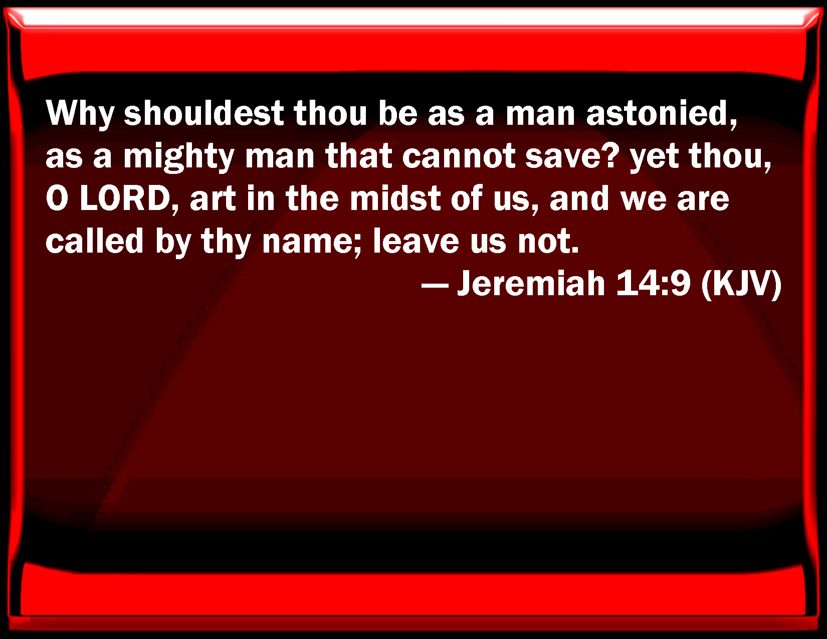 Bible Verse Slide Jeremiah 14:9 Why should you be as a man astonished, as a mighty man that cannot save? yet you, O LORD, are in the middle of us, and we are called by your name; leave us not. KJV: Why shouldest thou be as a man astonied, as a mighty man that cannot save? yet thou, O LORD, art in the midst of us, and we are called by thy name; leave us not. DRB: Why wilt thou be as a wandering man, as a mighty man that cannot save? but thou, O Lord, art among us, and thy name is called upon by us, forsake us not. DBT: Why wilt thou be as a man astonished, as a mighty man that cannot save? Yet thou, Jehovah, art in the midst of us, and we are called by thy name: leave us not. ERV: Why shouldest thou be as a man astonied, as a mighty man that cannot save? yet thou, O LORD, art in the midst of us, and we are called by thy name; leave us not. WBT: Why shouldst thou be as a man astonished, as a mighty man that cannot save? yet thou, O LORD, art in the midst of us, and we are called by thy name; leave us not. WEB: Why should you be like a scared man, as a mighty man who can't save? Yet you, Yahweh, are in the midst of us, and we are called by your name; don't leave us. YLT: Why art Thou as one dumb? As a mighty one not able to save? And Thou art in our midst, O Jehovah, And Thy name over us is called, leave us not.Links Jeremiah 14:9 NIV • Jeremiah 14:9 NLT • Jeremiah 14:9 ESV • Jeremiah 14:9 NASB • Jeremiah 14:9 KJV • Jeremiah 14:9 Interlinear • Jeremiah 14:9 Commentaries • Jeremiah 14:9 Parallel Texts • Jeremiah 14:9 Bible Apps • Jeremiah 14:9 Parallel • Bible Hub |