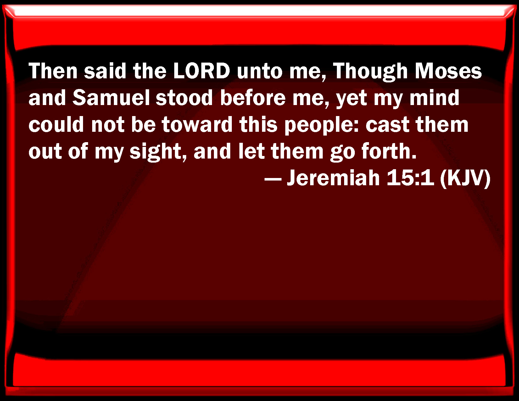 Bible Verse Slide Jeremiah 15:1 Then said the LORD to me, Though Moses and Samuel stood before me, yet my mind could not be toward this people: cast them out of my sight, and let them go forth. KJV: Then said the LORD unto me, Though Moses and Samuel stood before me, yet my mind could not be toward this people: cast them out of my sight, and let them go forth. DRB: And the Lord said to me: If Moses and Samuel shall stand before me, my soul is not towards this people: cast them out from my sight, and let them go forth. DBT: And Jehovah said unto me, Though Moses and Samuel stood before me, my soul would not turn toward this people. Send them out of my sight, and let them go forth. ERV: Then said the LORD unto me, Though Moses and Samuel stood before me, yet my mind could not be toward this people: cast them out of my sight, and let them go forth. WBT: Then said the LORD to me, Though Moses and Samuel stood before me, yet my mind could not be towards this people: cast them out of my sight, and let them go forth. WEB: Then Yahweh said to me, Though Moses and Samuel stood before me, yet my mind would not be toward this people: cast them out of my sight, and let them go forth. YLT: And Jehovah saith unto me: Though Moses and Samuel should stand before Me, My soul is not toward this people, Send from before My face, and they go out.Links Jeremiah 15:1 NIV • Jeremiah 15:1 NLT • Jeremiah 15:1 ESV • Jeremiah 15:1 NASB • Jeremiah 15:1 KJV • Jeremiah 15:1 Interlinear • Jeremiah 15:1 Commentaries • Jeremiah 15:1 Parallel Texts • Jeremiah 15:1 Bible Apps • Jeremiah 15:1 Parallel • Bible Hub |