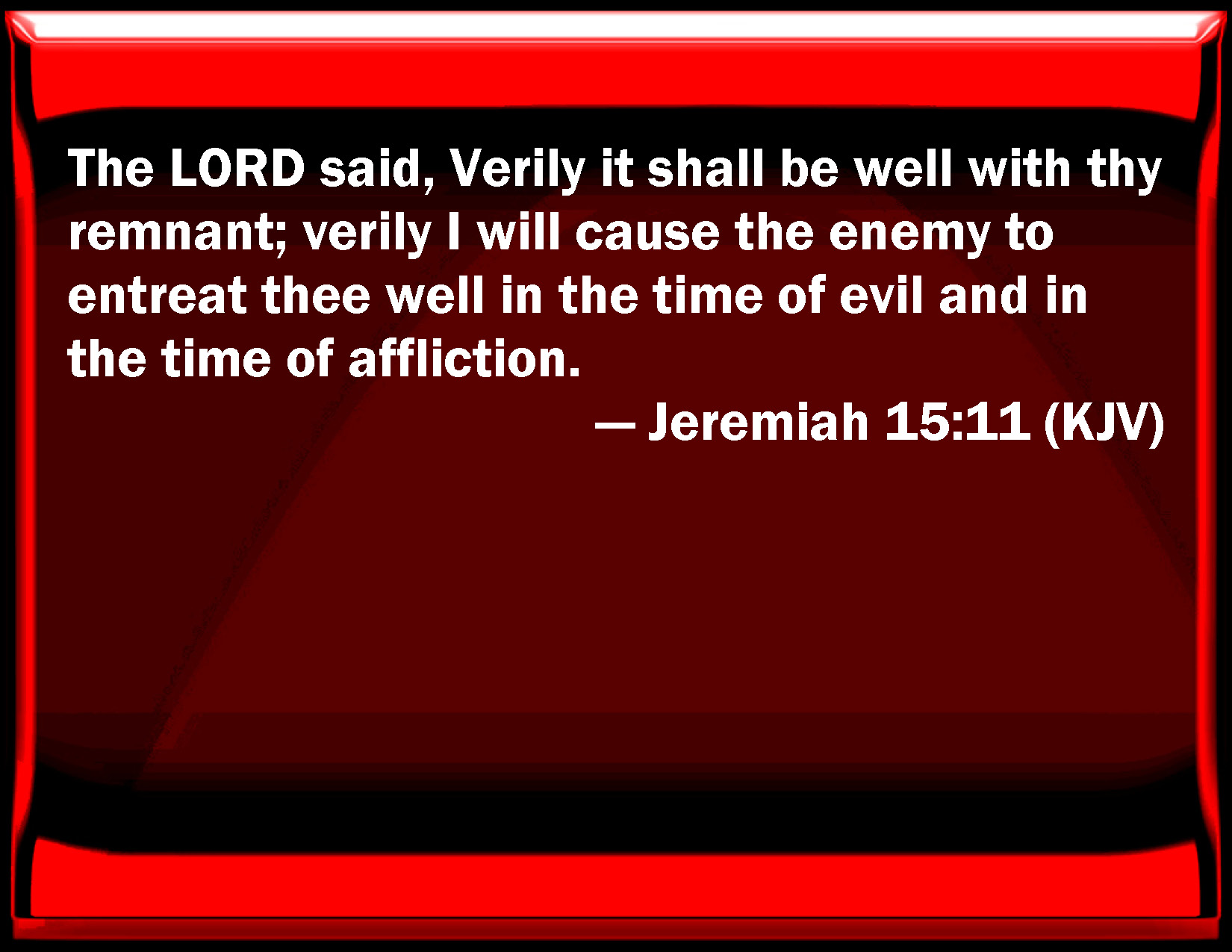 Bible Verse Slide Jeremiah 15:11 The LORD said, Truly it shall be well with your remnant; truly I will cause the enemy to entreat you well in the time of evil and in the time of affliction. KJV: The LORD said, Verily it shall be well with thy remnant; verily I will cause the enemy to entreat thee well in the time of evil and in the time of affliction. DRB: The Lord saith to me: Assuredly it shall be well with thy remnant, assuredly I shall help thee in the time of affliction, and in the time of tribulation against the enemy. DBT: Jehovah said, Verily I will set thee free for thy good; verily I will cause the enemy to meet thee kindly in the time of evil and in the time of affliction. ERV: The LORD said, Verily I will strengthen thee for good; verily I will cause the enemy to make supplication unto thee in the time of evil and in the time of affliction. WBT: The LORD said, Verily it shall be well with thy remnant; verily I will cause the enemy to treat thee well in the time of evil and in the time of affliction. WEB: Yahweh said, Most certainly I will strengthen you for good; most certainly I will cause the enemy to make supplication to you in the time of evil and in the time of affliction. YLT: Jehovah said, Did I not direct thee for good? Did not I intercede for thee in a time of evil, And in a time of adversity, with the enemy?Links Jeremiah 15:11 NIV • Jeremiah 15:11 NLT • Jeremiah 15:11 ESV • Jeremiah 15:11 NASB • Jeremiah 15:11 KJV • Jeremiah 15:11 Interlinear • Jeremiah 15:11 Commentaries • Jeremiah 15:11 Parallel Texts • Jeremiah 15:11 Bible Apps • Jeremiah 15:11 Parallel • Bible Hub |