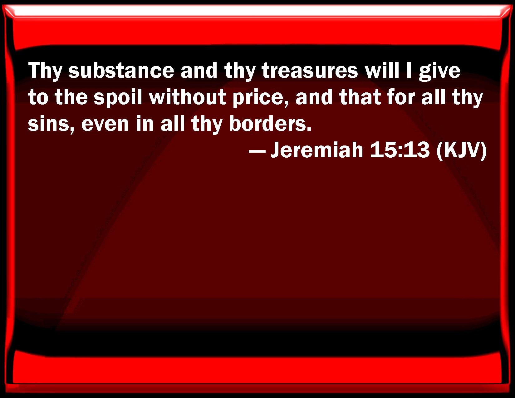 Bible Verse Slide Jeremiah 15:13 Your substance and your treasures will I give to the spoil without price, and that for all your sins, even in all your borders. KJV: Thy substance and thy treasures will I give to the spoil without price, and that for all thy sins, even in all thy borders. DRB: Thy riches and thy treasures I will give unto spoil for nothing, because of all thy sins, even in all thy borders. DBT: Thy substance and thy treasures will I give to the spoil without price, and that for all thy sins, and in all thy borders; ERV: Thy substance and thy treasures will I give for a spoil without price, and that for all thy sins, even in all thy borders. WBT: Thy substance and thy treasures will I give to the spoil without price, and that for all thy sins, even in all thy borders. WEB: Your substance and your treasures will I give for a spoil without price, and that for all your sins, even in all your borders. YLT: Thy strength and thy treasures For a prey I do give — not for price, Even for all thy sins, and in all thy borders.Links Jeremiah 15:13 NIV • Jeremiah 15:13 NLT • Jeremiah 15:13 ESV • Jeremiah 15:13 NASB • Jeremiah 15:13 KJV • Jeremiah 15:13 Interlinear • Jeremiah 15:13 Commentaries • Jeremiah 15:13 Parallel Texts • Jeremiah 15:13 Bible Apps • Jeremiah 15:13 Parallel • Bible Hub |
