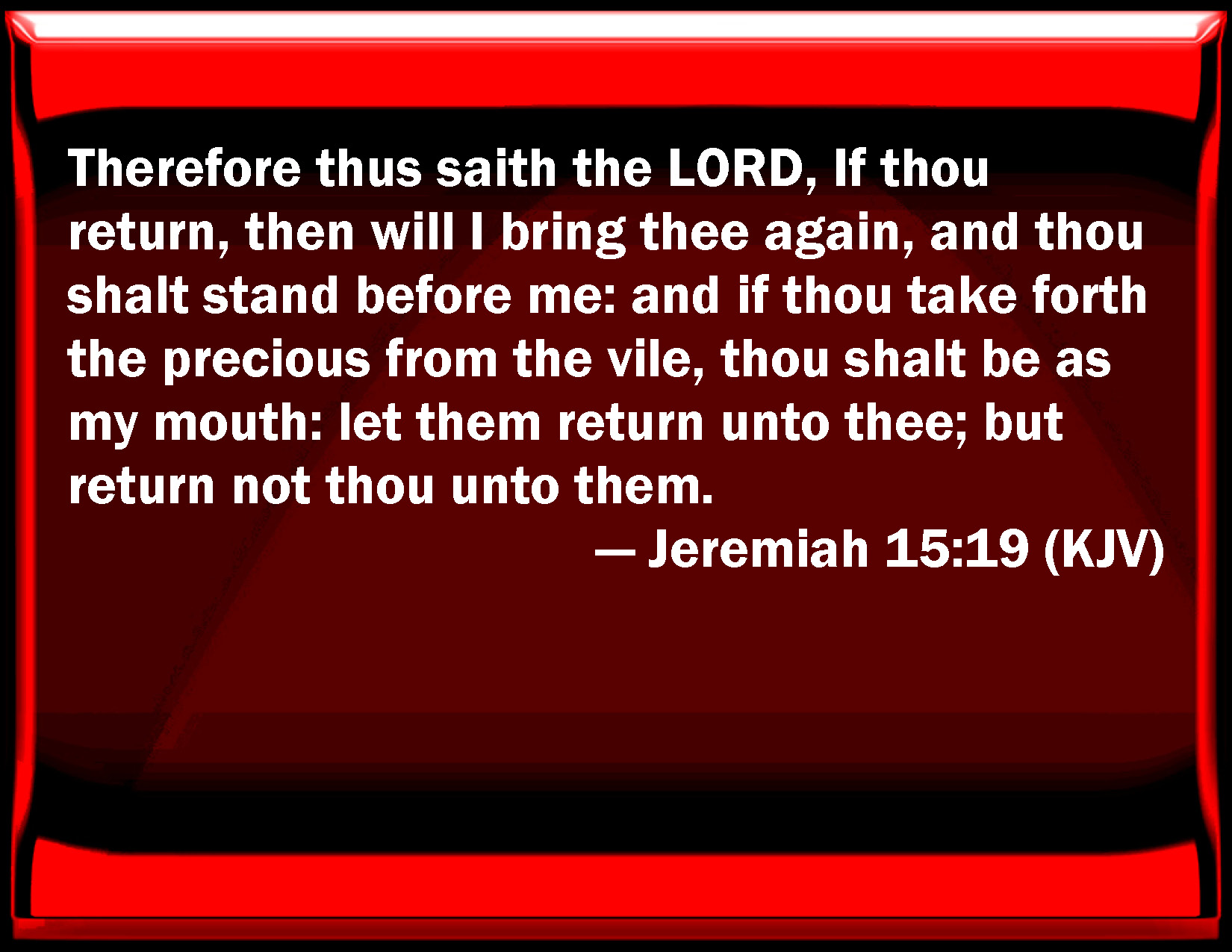 Bible Verse Slide Jeremiah 15:19 Therefore thus said the LORD, If you return, then will I bring you again, and you shall stand before me: and if you take forth the precious from the vile, you shall be as my mouth: let them return to you; but return not you to them. KJV: Therefore thus saith the LORD, If thou return, then will I bring thee again, and thou shalt stand before me: and if thou take forth the precious from the vile, thou shalt be as my mouth: let them return unto thee; but return not thou unto them. DRB: Therefore thus saith the Lord: If thou wilt be converted, I will convert thee, and thou shalt stand before my face; and if thou wilt separate the precious from the vile, thou shalt be as my mouth: they shall be turned to thee, and thou shalt not be turned to them. DBT: Therefore thus saith Jehovah: If thou return, then will I bring thee again, thou shalt stand before me; and if thou take forth the precious from the vile, thou shalt be as my mouth. Let them return unto thee; but return not thou unto them. ERV: Therefore thus saith the LORD, If thou return, then will I bring thee again, that thou mayest stand before me; and if thou take forth the precious from the vile, thou shalt be as my mouth: they shall return unto thee, but thou shalt not return unto them. WBT: Therefore thus saith the LORD, If thou shalt return, then will I bring thee again, and thou shalt stand before me: and if thou shalt separate the precious from the vile, thou shalt be as my mouth: let them return to thee; but return not thou to them. WEB: Therefore thus says Yahweh, If you return, then will I bring you again, that you may stand before me; and if you take forth the precious from the vile, you shall be as my mouth: they shall return to you, but you shall not return to them. YLT: Therefore, thus said Jehovah: If thou turnest back, then I bring thee back, Before Me thou dost stand, And if thou bringest out the precious from the vile, As My mouth thou art! They — they turn back unto thee, And thou dost not turn back unto them.Links Jeremiah 15:19 NIV • Jeremiah 15:19 NLT • Jeremiah 15:19 ESV • Jeremiah 15:19 NASB • Jeremiah 15:19 KJV • Jeremiah 15:19 Interlinear • Jeremiah 15:19 Commentaries • Jeremiah 15:19 Parallel Texts • Jeremiah 15:19 Bible Apps • Jeremiah 15:19 Parallel • Bible Hub |