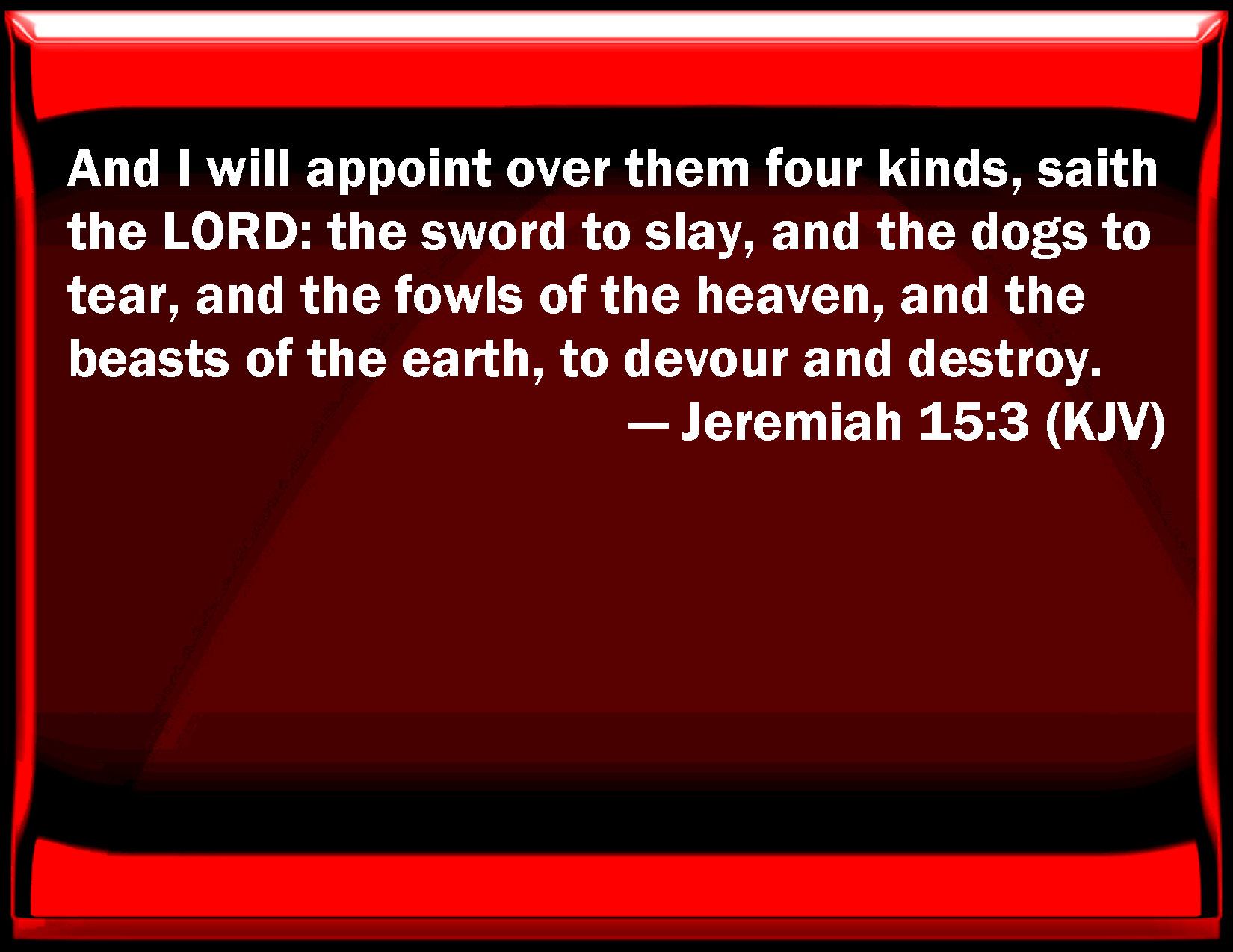 Bible Verse Slide Jeremiah 15:3 And I will appoint over them four kinds, said the LORD: the sword to slay, and the dogs to tear, and the fowls of the heaven, and the beasts of the earth, to devour and destroy. KJV: And I will appoint over them four kinds, saith the LORD: the sword to slay, and the dogs to tear, and the fowls of the heaven, and the beasts of the earth, to devour and destroy. DRB: And I will visit them with four kinds, saith the Lord: The sword to kill, and the dogs to tear, and the fowls of the air, and the beasts of the earth, to devour and destroy. DBT: For I will visit them with four kinds of punishments, saith Jehovah: the sword to slay, and dogs to tear, and the fowl of the heavens, and the beasts of the earth, to devour and to destroy. ERV: And I will appoint over them four kinds, saith the LORD: the sword to slay, and the dogs to tear, and the fowls of the heaven, and the beasts of the earth, to devour and to destroy. WBT: And I will appoint over them four kinds, saith the LORD: the sword to slay, and the dogs to tear, and the fowls of the heaven, and the beasts of the earth, to devour and destroy. WEB: I will appoint over them four kinds, says Yahweh: the sword to kill, and the dogs to tear, and the birds of the sky, and the animals of the earth, to devour and to destroy. YLT: And I have appointed over them four kinds, an affirmation of Jehovah, The sword to slay, and the dogs to drag, And the fowl of the heavens, And the beast of the earth, to consume and to devour.Links Jeremiah 15:3 NIV • Jeremiah 15:3 NLT • Jeremiah 15:3 ESV • Jeremiah 15:3 NASB • Jeremiah 15:3 KJV • Jeremiah 15:3 Interlinear • Jeremiah 15:3 Commentaries • Jeremiah 15:3 Parallel Texts • Jeremiah 15:3 Bible Apps • Jeremiah 15:3 Parallel • Bible Hub |