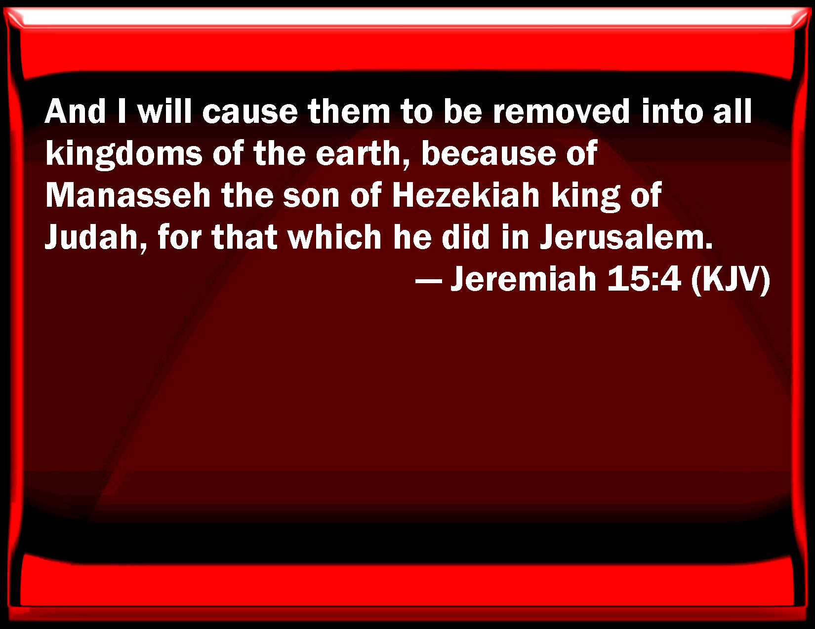 Bible Verse Slide Jeremiah 15:4 And I will cause them to be removed into all kingdoms of the earth, because of Manasseh the son of Hezekiah king of Judah, for that which he did in Jerusalem. KJV: And I will cause them to be removed into all kingdoms of the earth, because of Manasseh the son of Hezekiah king of Judah, for that which he did in Jerusalem. DRB: And I will give them up to the rage of all the kingdoms of the earth: because of Manasses the son of Ezechias the king of Juda, for all that he did in Jerusalem. DBT: And I will give them over to be driven hither and thither amongst all the kingdoms of the earth, because of Manasseh the son of Hezekiah, king of Judah, for that which he did in Jerusalem. ERV: And I will cause them to be tossed to and fro among all the kingdoms of the earth, because of Manasseh the son of Hezekiah king of Judah, for that which he did in Jerusalem. WBT: And I will cause them to be removed into all kingdoms of the earth, because of Manasseh the son of Hezekiah king of Judah, for that which he did in Jerusalem. WEB: I will cause them to be tossed back and forth among all the kingdoms of the earth, because of Manasseh, the son of Hezekiah, king of Judah, for that which he did in Jerusalem. YLT: And I have given them for a trembling To all kingdoms of the earth, Because of Manasseh son of Hezekiah king of Judah, For that which he did in Jerusalem.Links Jeremiah 15:4 NIV • Jeremiah 15:4 NLT • Jeremiah 15:4 ESV • Jeremiah 15:4 NASB • Jeremiah 15:4 KJV • Jeremiah 15:4 Interlinear • Jeremiah 15:4 Commentaries • Jeremiah 15:4 Parallel Texts • Jeremiah 15:4 Bible Apps • Jeremiah 15:4 Parallel • Bible Hub |