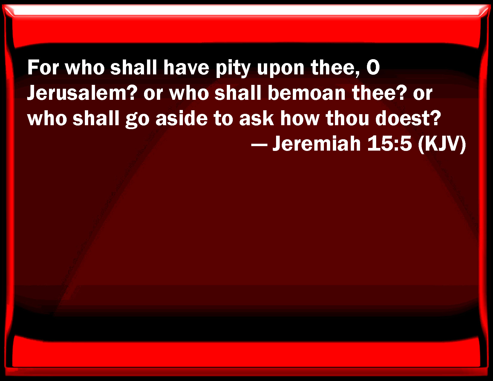 Jeremiah 15:5 For who shall have pity on you, O Jerusalem? or who shall bemoan you? or who shall go aside to ask how you do?