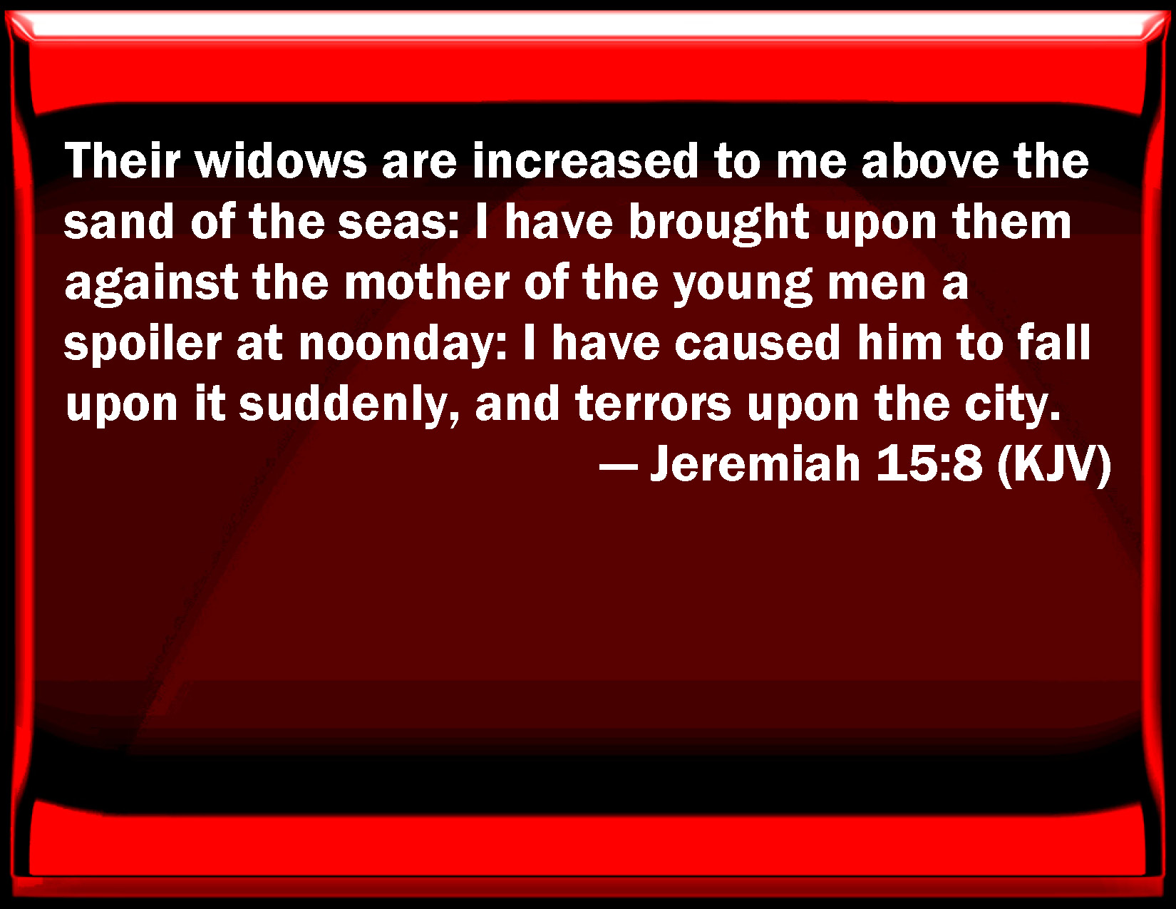 Jeremiah 15:8 Their widows are increased to me above the sand of the seas: I have brought on them against the mother of the young men a spoiler at noonday: I have caused him to fall on it suddenly, and terrors on the city.
