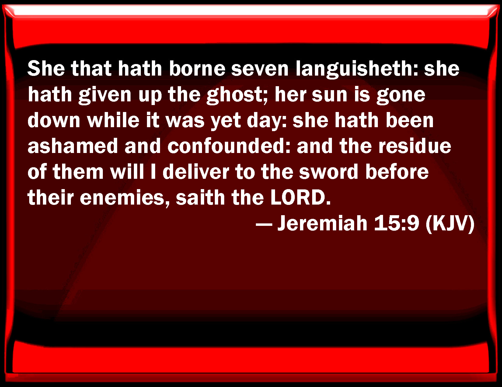 Jeremiah 15:9 She that has borne seven languishes: she has given up the ghost; her sun is gone down while it was yet day: she has been ashamed and confounded: and the residue of them will I deliver to the sword before their enemies, said the LORD.