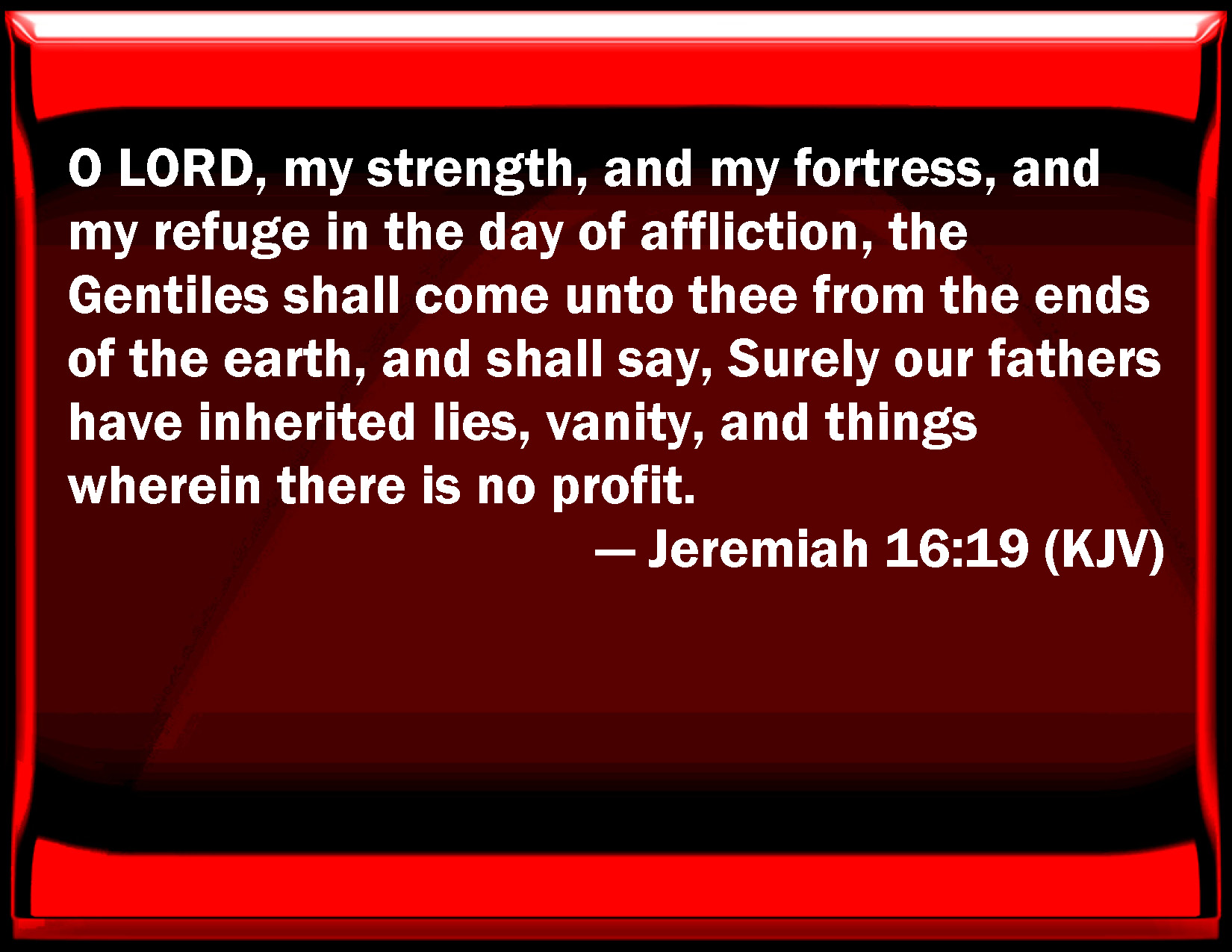 Bible Verse Slide Jeremiah 16:19 O LORD, my strength, and my fortress, and my refuge in the day of affliction, the Gentiles shall come to you from the ends of the earth, and shall say, Surely our fathers have inherited lies, vanity, and things wherein there is no profit. KJV: O LORD, my strength, and my fortress, and my refuge in the day of affliction, the Gentiles shall come unto thee from the ends of the earth, and shall say, Surely our fathers have inherited lies, vanity, and things wherein there is no profit. DRB: O Lord, my might, and my strength, and my refuge in the day of tribulation: to thee the Gentiles shall come from the ends of the earth, and shall say: Surely our fathers have possessed lies, a vanity which hath not profited them. DBT: Jehovah, my strength and my fortress, and my refuge in the day of distress, unto thee shall the nations come from the ends of the earth, and they shall say, Surely our fathers have inherited falsehood and vanity; and in these things there is no profit. ERV: O LORD, my strength, and my strong hold, and my refuge in the day of affliction, unto thee shall the nations come from the ends of the earth, and shall say, Our fathers have inherited nought but lies, even vanity and things wherein there is no profit. WBT: O LORD, my strength and my fortress, and my refuge in the day of affliction, the Gentiles shall come to thee from the ends of the earth, and shall say, Surely our fathers have inherited lies, vanity, and things in which there is no profit. WEB: Yahweh, my strength, and my stronghold, and my refuge in the day of affliction, to you shall the nations come from the ends of the earth, and shall say, Our fathers have inherited nothing but lies, [even] vanity and things in which there is no profit. YLT: O Jehovah, my strength, and my fortress, And my refuge in a day of adversity, Unto Thee nations do come from the ends of earth, And say, Only falsehood did our fathers inherit, Vanity, and none among them is profitable.Links Jeremiah 16:19 NIV • Jeremiah 16:19 NLT • Jeremiah 16:19 ESV • Jeremiah 16:19 NASB • Jeremiah 16:19 KJV • Jeremiah 16:19 Interlinear • Jeremiah 16:19 Commentaries • Jeremiah 16:19 Parallel Texts • Jeremiah 16:19 Bible Apps • Jeremiah 16:19 Parallel • Bible Hub |