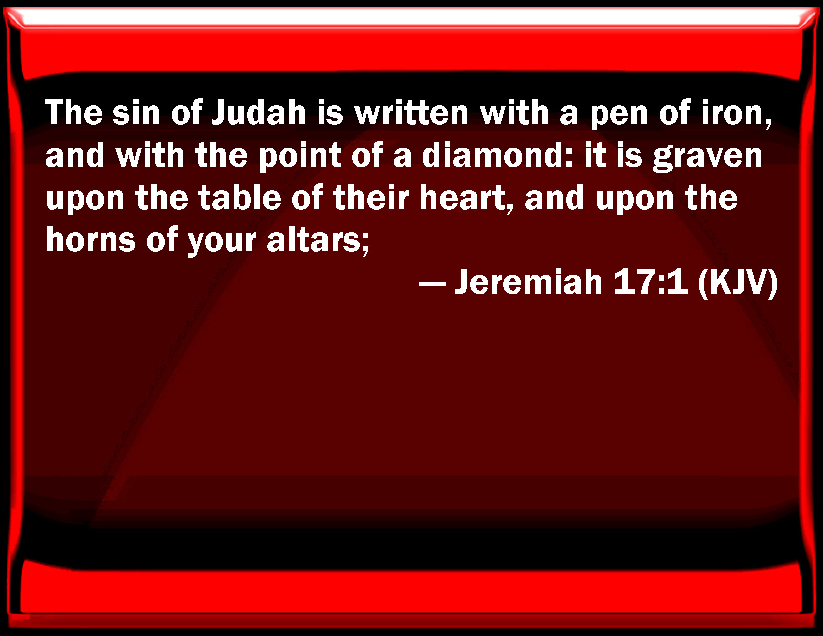 Bible Verse Slide Jeremiah 17:1 The sin of Judah is written with a pen of iron, and with the point of a diamond: it is graven on the table of their heart, and on the horns of your altars; KJV: The sin of Judah is written with a pen of iron, and with the point of a diamond: it is graven upon the table of their heart, and upon the horns of your altars; DRB: The sin of Juda is written with a pen of iron, with the point of a diamond, it is graven upon the table of their heart, upon the horns of their altars. DBT: The sin of Judah is written with a style of iron, with the point of a diamond, engraven upon the tablet of their heart, and upon the horns of your altars; ERV: The sin of Judah is written with a pen of iron, and with the point of a diamond: it is graven upon the table of their heart, and upon the horns of your altars; WBT: The sin of Judah is written with a pen of iron, and with the point of a diamond: it is graven upon the table of their heart, and upon the horns of your altars; WEB: The sin of Judah is written with a pen of iron, [and] with the point of a diamond: it is engraved on the tablet of their heart, and on the horns of your altars; YLT: The sin of Judah is written with a pen of iron, With the point of a diamond, Graven on the tablet of their heart, And on the horns of your altars,Links Jeremiah 17:1 NIV • Jeremiah 17:1 NLT • Jeremiah 17:1 ESV • Jeremiah 17:1 NASB • Jeremiah 17:1 KJV • Jeremiah 17:1 Interlinear • Jeremiah 17:1 Commentaries • Jeremiah 17:1 Parallel Texts • Jeremiah 17:1 Bible Apps • Jeremiah 17:1 Parallel • Bible Hub |