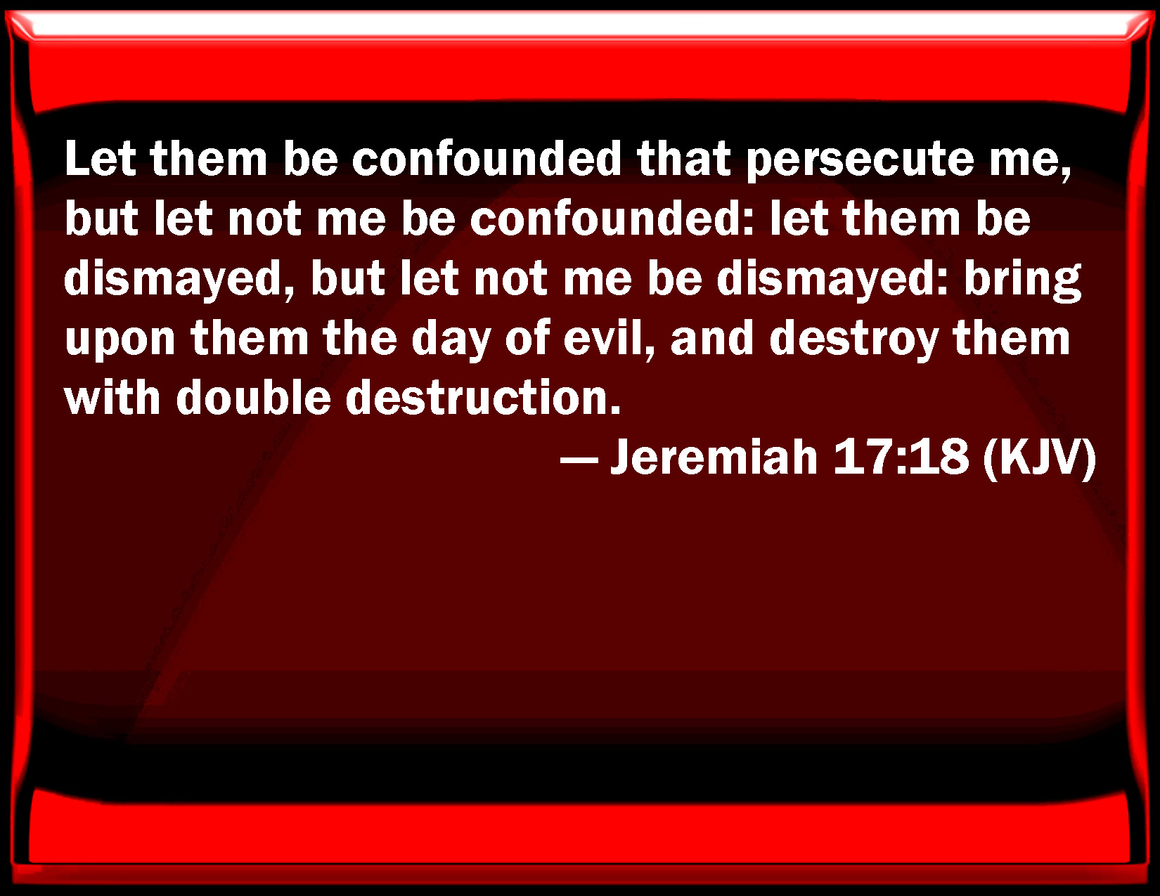 Bible Verse Slide Jeremiah 17:18 Let them be confounded that persecute me, but let not me be confounded: let them be dismayed, but let not me be dismayed: bring on them the day of evil, and destroy them with double destruction. KJV: Let them be confounded that persecute me, but let not me be confounded: let them be dismayed, but let not me be dismayed: bring upon them the day of evil, and destroy them with double destruction. DRB: Let them be confounded that persecute me, and let not me be confounded: let them be afraid, and let not me be afraid: bring upon them the day of affliction, and with a double destruction, destroy them. DBT: Let them be ashamed that persecute me, but let not me be ashamed; let them be dismayed, but let not me be dismayed; bring upon them the day of evil, and break them with a double breaking. ERV: Let them be ashamed that persecute me, but let not me be ashamed; let them be dismayed, but let not me be dismayed: bring upon them the day of evil, and destroy them with double destruction. WBT: Let them be confounded that persecute me, but let not me be confounded: let them be dismayed, but let not me be dismayed: bring upon them the day of evil, and destroy them with double destruction. WEB: Let them be disappointed who persecute me, but let not me be disappointed; let them be dismayed, but don't let me be dismayed; bring on them the day of evil, and destroy them with double destruction. YLT: Let my pursuers be ashamed, and let not me be ashamed — me! Let them be affrighted, and let not me be affrighted — me! Bring in on them a day of evil, And a second time with destruction destroy them.Links Jeremiah 17:18 NIV • Jeremiah 17:18 NLT • Jeremiah 17:18 ESV • Jeremiah 17:18 NASB • Jeremiah 17:18 KJV • Jeremiah 17:18 Interlinear • Jeremiah 17:18 Commentaries • Jeremiah 17:18 Parallel Texts • Jeremiah 17:18 Bible Apps • Jeremiah 17:18 Parallel • Bible Hub |