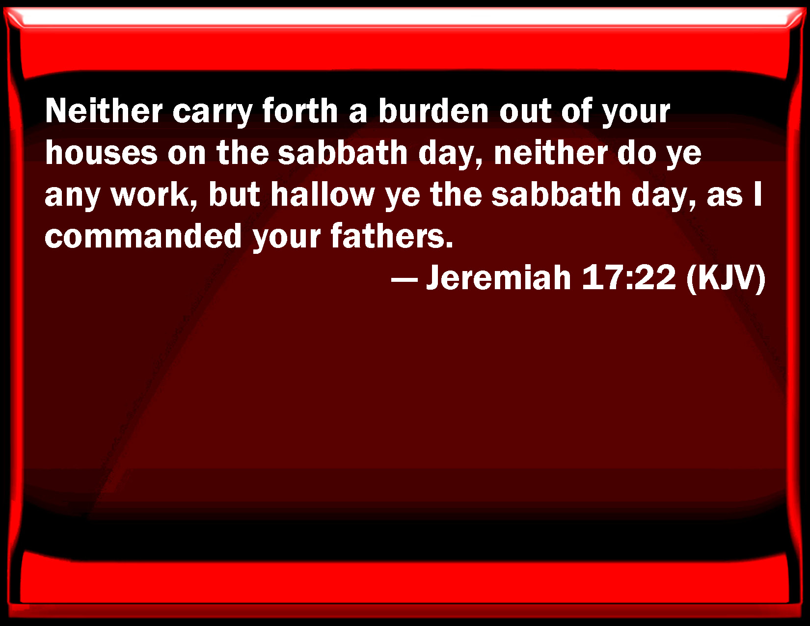 Bible Verse Slide Jeremiah 17:22 Neither carry forth a burden out of your houses on the sabbath day, neither do you any work, but hallow you the sabbath day, as I commanded your fathers. KJV: Neither carry forth a burden out of your houses on the sabbath day, neither do ye any work, but hallow ye the sabbath day, as I commanded your fathers. DRB: And do not bring burdens out of your houses on the sabbath day, neither do ye any work: sanctify the sabbath day, as I commanded your fathers. DBT: and carry forth no burden out of your houses on the sabbath day, neither do any work; but hallow ye the sabbath day, as I commanded your fathers, ERV: neither carry forth a burden out of your houses on the sabbath day, neither do ye any work: but hallow ye the sabbath day, as I commanded your fathers; WBT: Neither carry forth a burden out of your houses on the sabbath day, neither do ye any work, but hallow ye the sabbath day, as I commanded your fathers. WEB: neither carry forth a burden out of your houses on the Sabbath day holy, neither do any work: but make the Sabbath day, as I commanded your fathers. YLT: Nor do ye take out a burden from your houses on the day of rest, Yea, any work ye do not do, And ye have sanctified the day of rest, As I have commanded your fathers.Links Jeremiah 17:22 NIV • Jeremiah 17:22 NLT • Jeremiah 17:22 ESV • Jeremiah 17:22 NASB • Jeremiah 17:22 KJV • Jeremiah 17:22 Interlinear • Jeremiah 17:22 Commentaries • Jeremiah 17:22 Parallel Texts • Jeremiah 17:22 Bible Apps • Jeremiah 17:22 Parallel • Bible Hub |
