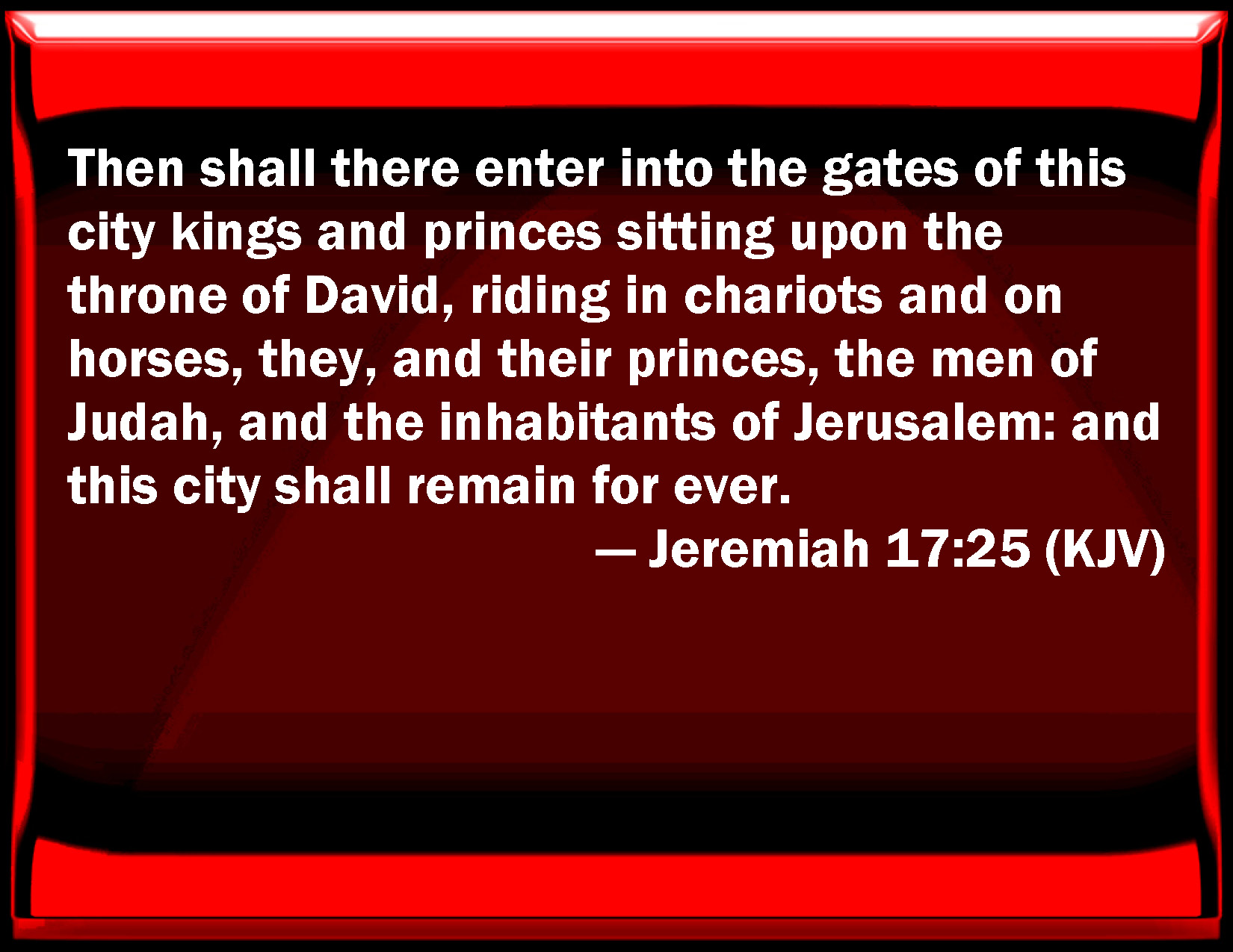 Bible Verse Slide Jeremiah 17:25 Then shall there enter into the gates of this city kings and princes sitting on the throne of David, riding in chariots and on horses, they, and their princes, the men of Judah, and the inhabitants of Jerusalem: and this city shall remain for ever. KJV: Then shall there enter into the gates of this city kings and princes sitting upon the throne of David, riding in chariots and on horses, they, and their princes, the men of Judah, and the inhabitants of Jerusalem: and this city shall remain for ever. DRB: Then shall there enter in by the gates of this city kings and princes, sitting upon the throne of David, and riding in chariots and on horses, they and their princes, the men of Juda, and the inhabitants of Jerusalem: and this city shall be inhabited forever. DBT: then shall there enter in, through the gates of this city, kings and princes sitting upon the throne of David, riding in chariots and on horses, they and their princes, the men of Judah and the inhabitants of Jerusalem: and this city shall be inhabited for ever. ERV: then shall there enter in by the gates of this city kings and princes sitting upon the throne of David, riding in chariots and on horses, they, and their princes, the men of Judah, and the inhabitants of Jerusalem: and this city shall remain for ever. WBT: Then shall there enter into the gates of this city kings and princes sitting upon the throne of David, riding in chariots and on horses, they and their princes, the men of Judah, and the inhabitants of Jerusalem: and this city shall remain for ever. WEB: then shall there enter in by the gates of this city kings and princes sitting on the throne of David, riding in chariots and on horses, they, and their princes, the men of Judah, and the inhabitants of Jerusalem; and this city shall remain forever. YLT: Then entered by the gates of this city have kings and princes, Sitting on the throne of David, Riding in a chariot, and on horses, They, and their princes, the man of Judah, And inhabitants of Jerusalem, And this city hath remained to the age.Links Jeremiah 17:25 NIV • Jeremiah 17:25 NLT • Jeremiah 17:25 ESV • Jeremiah 17:25 NASB • Jeremiah 17:25 KJV • Jeremiah 17:25 Interlinear • Jeremiah 17:25 Commentaries • Jeremiah 17:25 Parallel Texts • Jeremiah 17:25 Bible Apps • Jeremiah 17:25 Parallel • Bible Hub |