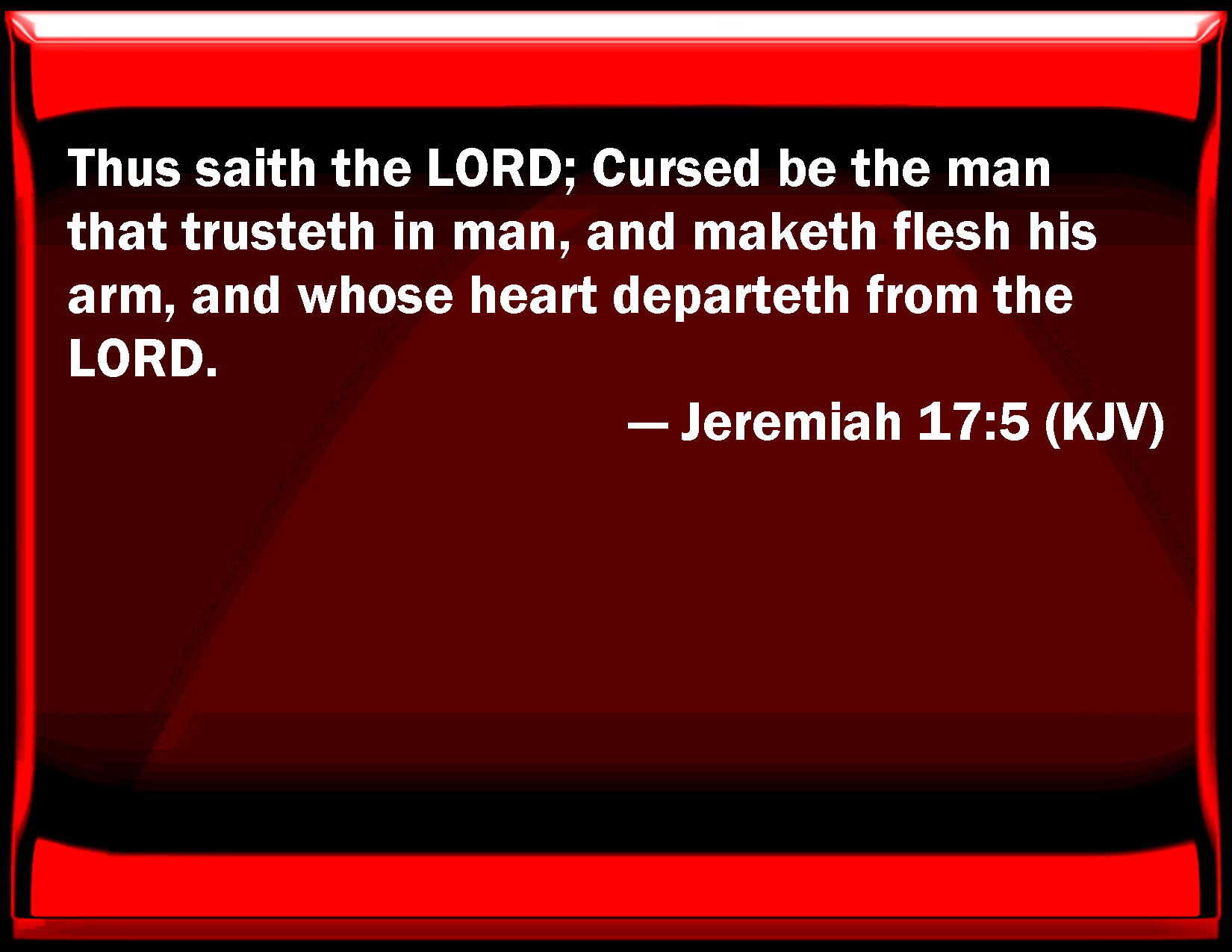 Bible Verse Slide Jeremiah 17:5 Thus said the LORD; Cursed be the man that trusts in man, and makes flesh his arm, and whose heart departs from the LORD. KJV: Thus saith the LORD; Cursed be the man that trusteth in man, and maketh flesh his arm, and whose heart departeth from the LORD. DRB: Thus saith the Lord: Cursed be the man that trusteth in man, and maketh flesh his arm, and whose heart departeth from the Lord. DBT: Thus saith Jehovah: Cursed is the man that confideth in man, and maketh flesh his arm, and whose heart departeth from Jehovah. ERV: Thus saith the LORD: Cursed is the man that trusteth in man, and maketh flesh his arm, and whose heart departeth from the LORD. WBT: Thus saith the LORD; Cursed be the man that trusteth in man, and maketh flesh his arm, and whose heart departeth from the LORD. WEB: Thus says Yahweh: Cursed is the man who trusts in man, and makes flesh his arm, and whose heart departs from Yahweh. YLT: Thus said Jehovah: Cursed is the man who doth trust in man, And hath made flesh his arm, And from Jehovah whose heart turneth.Links Jeremiah 17:5 NIV • Jeremiah 17:5 NLT • Jeremiah 17:5 ESV • Jeremiah 17:5 NASB • Jeremiah 17:5 KJV • Jeremiah 17:5 Interlinear • Jeremiah 17:5 Commentaries • Jeremiah 17:5 Parallel Texts • Jeremiah 17:5 Bible Apps • Jeremiah 17:5 Parallel • Bible Hub |