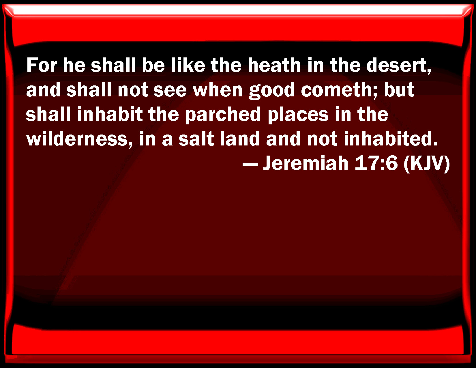 Bible Verse Slide Jeremiah 17:6 For he shall be like the heath in the desert, and shall not see when good comes; but shall inhabit the parched places in the wilderness, in a salt land and not inhabited. KJV: For he shall be like the heath in the desert, and shall not see when good cometh; but shall inhabit the parched places in the wilderness, in a salt land and not inhabited. DRB: For he shall be like tamaric in the desert, and he shall not see when good shall come: but he shall dwell in dryness in the desert in a salt land, and not inhabited. DBT: And he shall be like the heath in the desert, and shall not see when good cometh; but he shall inhabit the parched places in the wilderness, a salt land and not inhabited. ERV: For he shall be like the heath in the desert, and shall not see when good cometh; but shall inhabit the parched places in the wilderness, a salt land and not inhabited. WBT: For he shall be like the heath in the desert, and shall not see when good cometh; but shall inhabit the parched places in the wilderness, in a salt land and not inhabited. WEB: For he shall be like the heath in the desert, and shall not see when good comes, but shall inhabit the parched places in the wilderness, a salt land and not inhabited. YLT: And he hath been as a naked thing in a desert, And doth not see when good cometh, And hath inhabited parched places in a wilderness, A salt land, and not inhabited.Links Jeremiah 17:6 NIV • Jeremiah 17:6 NLT • Jeremiah 17:6 ESV • Jeremiah 17:6 NASB • Jeremiah 17:6 KJV • Jeremiah 17:6 Interlinear • Jeremiah 17:6 Commentaries • Jeremiah 17:6 Parallel Texts • Jeremiah 17:6 Bible Apps • Jeremiah 17:6 Parallel • Bible Hub |