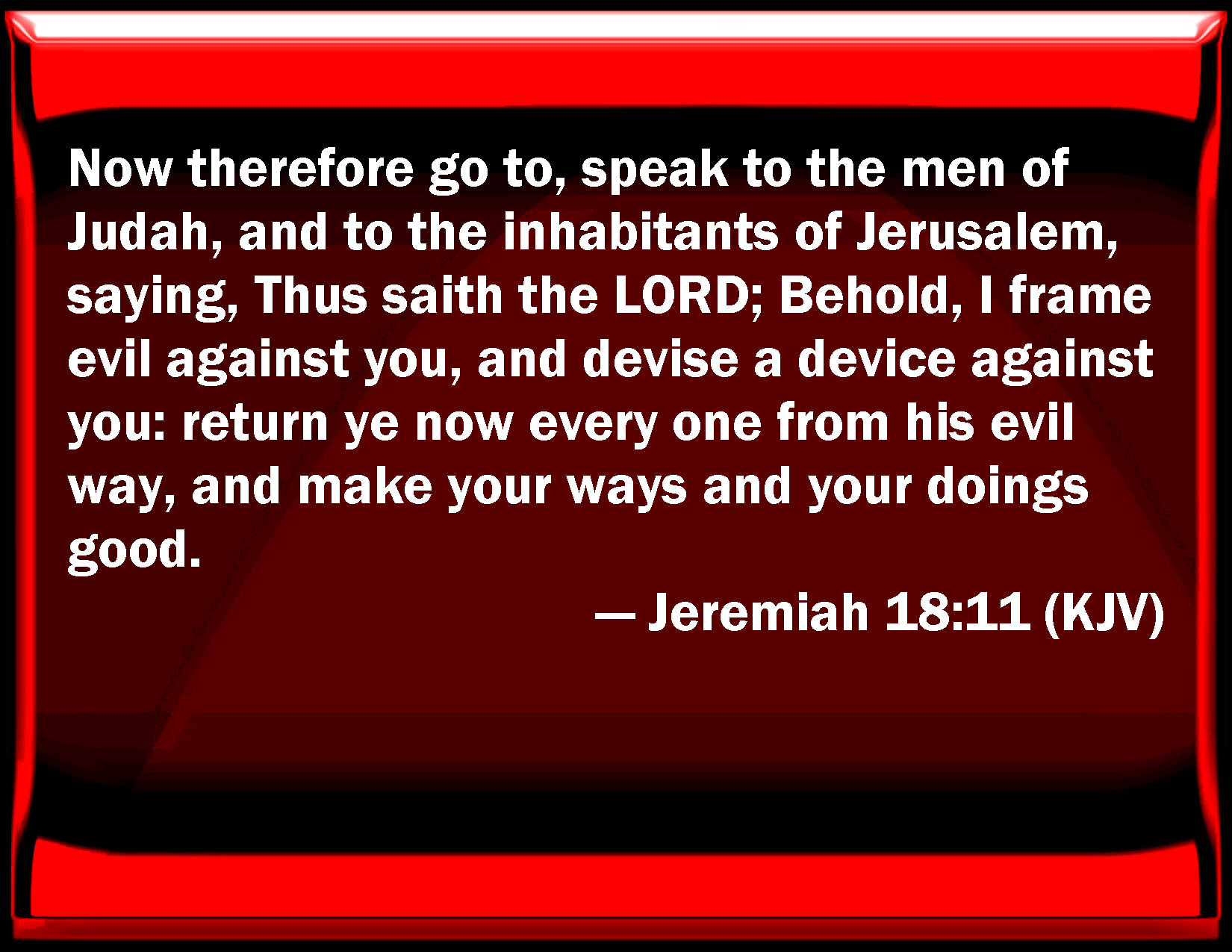 Bible Verse Slide Jeremiah 18:11 Now therefore go to, speak to the men of Judah, and to the inhabitants of Jerusalem, saying, Thus said the LORD; Behold, I frame evil against you, and devise a device against you: return you now every one from his evil way, and make your ways and your doings good. KJV: Now therefore go to, speak to the men of Judah, and to the inhabitants of Jerusalem, saying, Thus saith the LORD; Behold, I frame evil against you, and devise a device against you: return ye now every one from his evil way, and make your ways and your doings good. DRB: Now therefore tell the men of Juda, and the inhabitants of Jerusalem, saying: Thus saith the Lord: Behold I frame evil against you, and devise a device against you: let every man of you return from his evil way, and make ye your ways and your doings good. DBT: And now, speak to the men of Judah and to the inhabitants of Jerusalem, saying, Thus saith Jehovah: Behold, I prepare evil against you, and devise a device against you: turn ye then every one from his evil way, and amend your ways and your doings. ERV: Now therefore go to, speak to the men of Judah, and to the inhabitants of Jerusalem, saying, Thus saith the LORD: Behold, I frame evil against you, and devise a device against you: return ye now every one from his evil way, and amend your ways and your doings. WBT: Now therefore come, speak to the men of Judah, and to the inhabitants of Jerusalem, saying, Thus saith the LORD; Behold, I frame evil against you, and devise a device against you: return ye now every one from his evil way, and make your ways and your doings good. WEB: Now therefore, speak to the men of Judah, and to the inhabitants of Jerusalem, saying, Thus says Yahweh: Behold, I frame evil against you, and devise a device against you: return you now everyone from his evil way, and amend your ways and your doings. YLT: And now, speak, I pray thee, unto men of Judah, And against inhabitants of Jerusalem, Saying: Thus said Jehovah: Lo, I am framing against you evil, And devising against you a device, Turn back, I pray you, each from his evil way And amen your ways and your doings.Links Jeremiah 18:11 NIV • Jeremiah 18:11 NLT • Jeremiah 18:11 ESV • Jeremiah 18:11 NASB • Jeremiah 18:11 KJV • Jeremiah 18:11 Interlinear • Jeremiah 18:11 Commentaries • Jeremiah 18:11 Parallel Texts • Jeremiah 18:11 Bible Apps • Jeremiah 18:11 Parallel • Bible Hub |