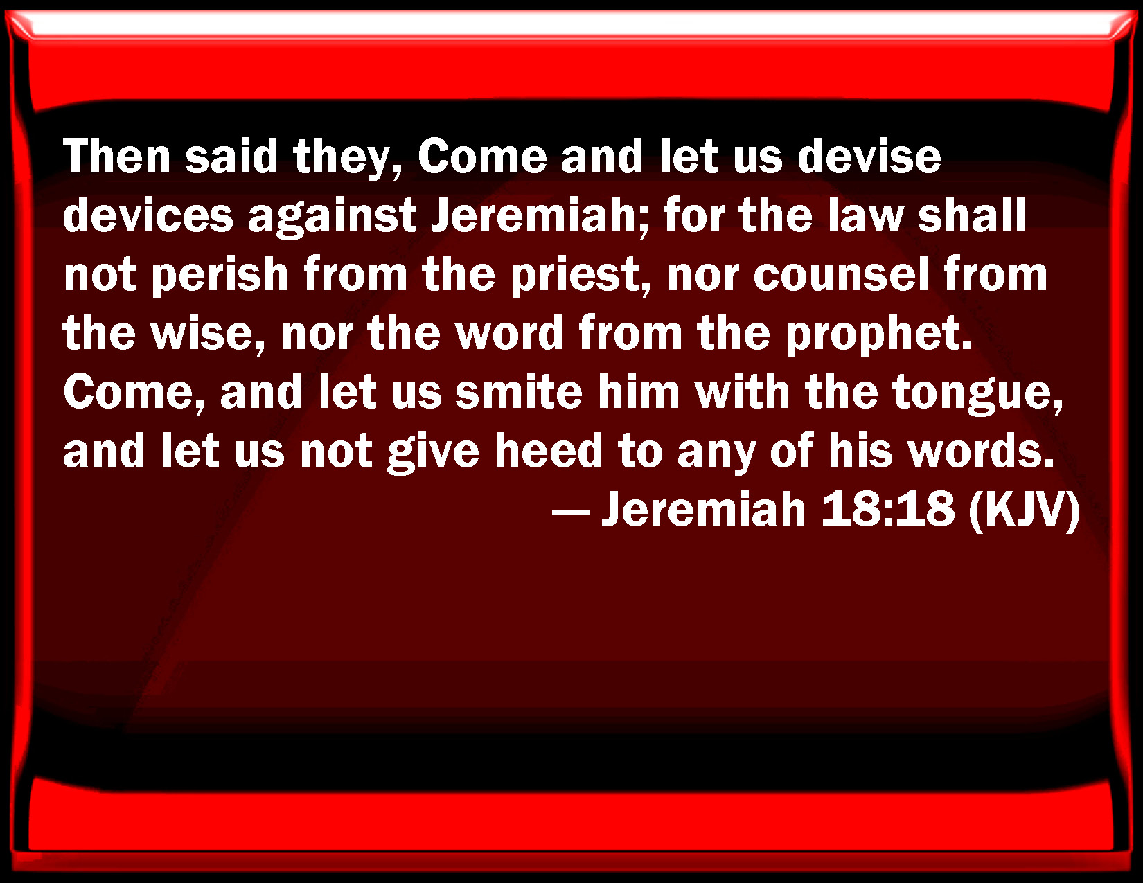 Bible Verse Slide Jeremiah 18:18 Then said they, Come and let us devise devices against Jeremiah; for the law shall not perish from the priest, nor counsel from the wise, nor the word from the prophet. Come, and let us smite him with the tongue, and let us not give heed to any of his words. KJV: Then said they, Come, and let us devise devices against Jeremiah; for the law shall not perish from the priest, nor counsel from the wise, nor the word from the prophet. Come, and let us smite him with the tongue, and let us not give heed to any of his words. DRB: And they said: Come, and let us invent devices against Jeremias: for the law shall not perish from the priest, nor counsel from the wise, nor the word from the prophet: come, and let us strike him with the tongue, and let us give no heed to all his words. DBT: And they said, Come, and let us devise devices against Jeremiah; for law shall not perish from the priest, nor counsel from the wise, nor word from the prophet. Come and let us smite him with the tongue, and let us not give heed to any of his words. ERV: Then said they, Come, and let us devise devices against Jeremiah; for the law shall not perish from the priest, nor counsel from the wise, nor the word from the prophet. Come, and let us smite him with the tongue, and let us not give heed to any of his words. WBT: Then said they, Come, and let us devise devices against Jeremiah; for the law shall not perish from the priest, nor counsel from the wise, nor the word from the prophet. Come, and let us smite him with the tongue, and let us not give heed to any of his words. WEB: Then they said, Come, and let us devise devices against Jeremiah; for the law shall not perish from the priest, nor counsel from the wise, nor the word from the prophet. Come, and let us strike him with the tongue, and let us not give heed to any of his words. YLT: And they say, Come, And we devise against Jeremiah devices, For law doth not perish from the priest, Nor counsel from the wise, Nor the word from the prophet, Come, and we smite him with the tongue, And we do not attend to any of his words.Links Jeremiah 18:18 NIV • Jeremiah 18:18 NLT • Jeremiah 18:18 ESV • Jeremiah 18:18 NASB • Jeremiah 18:18 KJV • Jeremiah 18:18 Interlinear • Jeremiah 18:18 Commentaries • Jeremiah 18:18 Parallel Texts • Jeremiah 18:18 Bible Apps • Jeremiah 18:18 Parallel • Bible Hub |