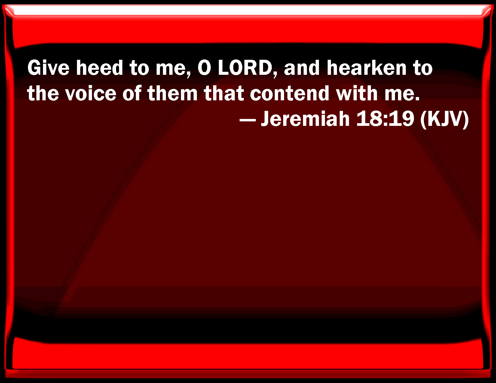 Bible Verse Slide Jeremiah 18:19 Give heed to me, O LORD, and listen to the voice of them that contend with me. KJV: Give heed to me, O LORD, and hearken to the voice of them that contend with me. DRB: Give heed to me, O Lord, and hear the voice of my adversaries. DBT: Jehovah, give heed to me, and listen to the voice of those that contend with me. ERV: Give heed to me, O LORD, and hearken to the voice of them that contend with me. WBT: Give heed to me, O LORD, and hearken to the voice of them that contend with me. WEB: Give heed to me, Yahweh, and listen to the voice of those who contend with me. YLT: Give attention, O Jehovah, unto me, And hearken to the voice of those contending with me.Links Jeremiah 18:19 NIV • Jeremiah 18:19 NLT • Jeremiah 18:19 ESV • Jeremiah 18:19 NASB • Jeremiah 18:19 KJV • Jeremiah 18:19 Interlinear • Jeremiah 18:19 Commentaries • Jeremiah 18:19 Parallel Texts • Jeremiah 18:19 Bible Apps • Jeremiah 18:19 Parallel • Bible Hub |