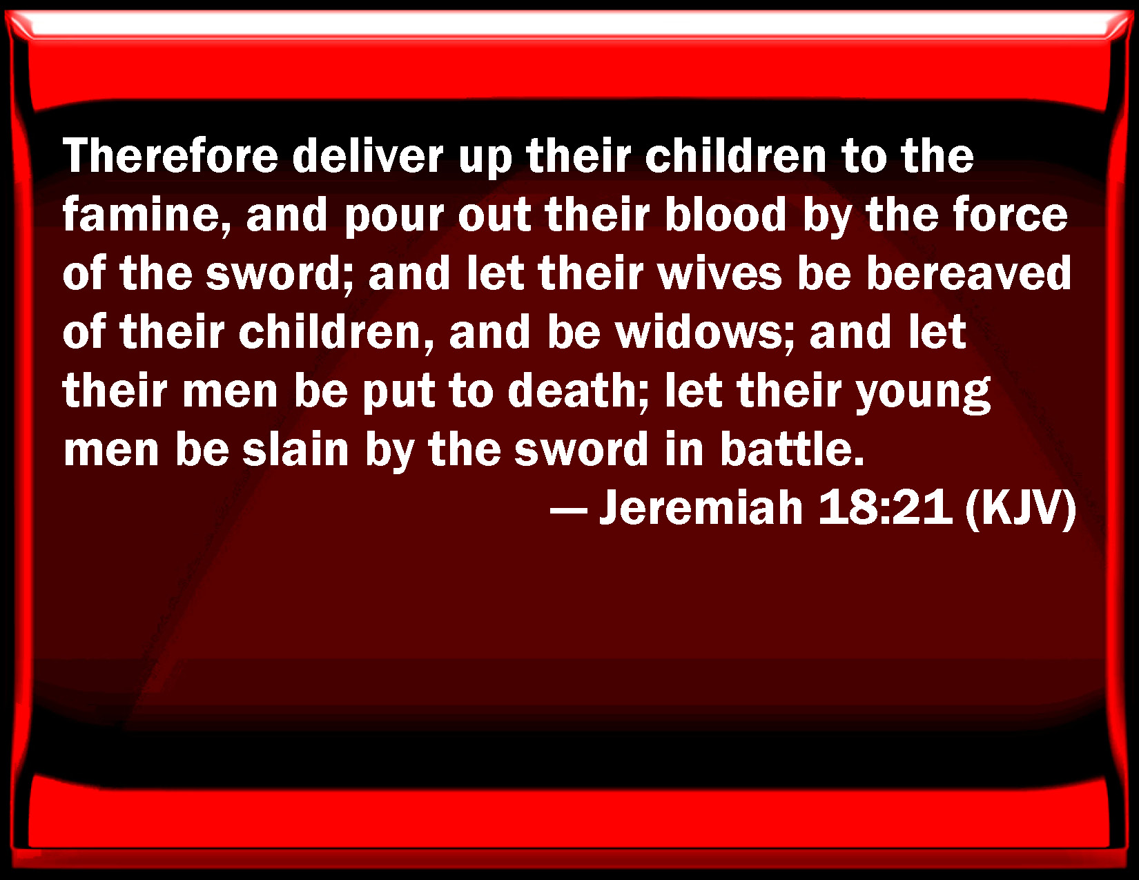 Bible Verse Slide Jeremiah 18:21 Therefore deliver up their children to the famine, and pour out their blood by the force of the sword; and let their wives be bereaved of their children, and be widows; and let their men be put to death; let their young men be slain by the sword in battle. KJV: Therefore deliver up their children to the famine, and pour out their blood by the force of the sword; and let their wives be bereaved of their children, and be widows; and let their men be put to death; let their young men be slain by the sword in battle. DRB: Therefore deliver up their children to famine, and bring them into the hands of the sword: let their wives be bereaved of children and widows: and let their husbands be slain by death: let their young men be stabbed with the sword in battle. DBT: Therefore give up their children to the famine, and deliver them over to the power of the sword; and let their wives be bereaved of children and be widows; and let their men be swept off by death, their young men be smitten by the sword in battle. ERV: Therefore deliver up their children to the famine, and give them over to the power of the sword; and let their wives become childless, and widows; and let their men be slain of death, and their young men smitten of the sword in battle. WBT: Therefore deliver their children to the famine, and pour out their blood by the force of the sword; and let their wives be bereaved of their children, and be widows; and let their men be put to death; let their young men be slain by the sword in battle. WEB: Therefore deliver up their children to the famine, and give them over to the power of the sword; and let their wives become childless, and widows; and let their men be slain of death, [and] their young men struck of the sword in battle. YLT: Therefore, give up their sons to famine, And cause them to run on the sides of the sword, And their wives are bereaved and widows, And their men are slain by death, Their young men smitten by sword in battle,Links Jeremiah 18:21 NIV • Jeremiah 18:21 NLT • Jeremiah 18:21 ESV • Jeremiah 18:21 NASB • Jeremiah 18:21 KJV • Jeremiah 18:21 Interlinear • Jeremiah 18:21 Commentaries • Jeremiah 18:21 Parallel Texts • Jeremiah 18:21 Bible Apps • Jeremiah 18:21 Parallel • Bible Hub |