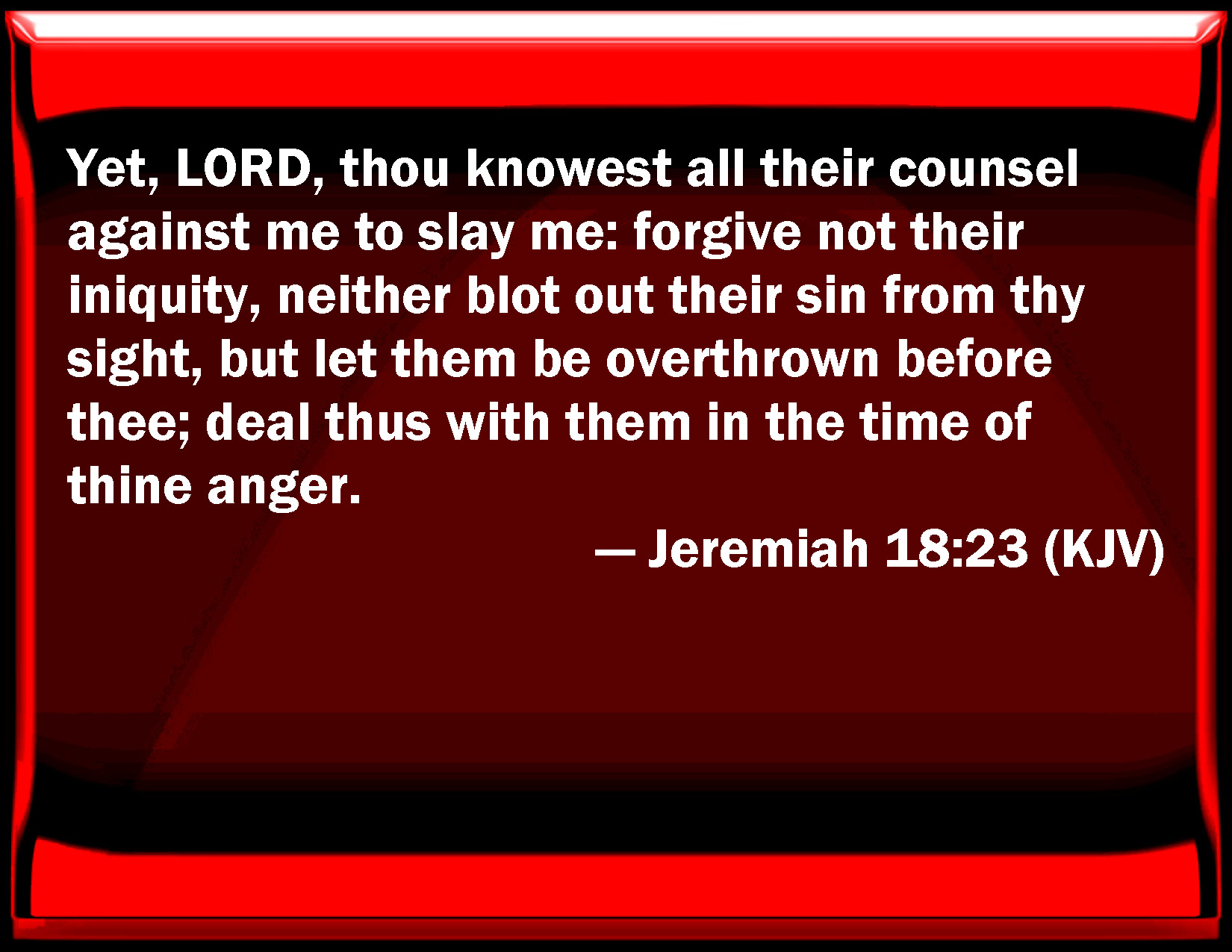 Bible Verse Slide Jeremiah 18:23 Yet, LORD, you know all their counsel against me to slay me: forgive not their iniquity, neither blot out their sin from your sight, but let them be overthrown before you; deal thus with them in the time of your anger. KJV: Yet, LORD, thou knowest all their counsel against me to slay me: forgive not their iniquity, neither blot out their sin from thy sight, but let them be overthrown before thee; deal thus with them in the time of thine anger. DRB: But thou, O Lord, knowest all their counsel against me unto death: forgive not their iniquity, and let not their sin be blotted out from thy sight: let them be overthrown before thy eyes, in the time of thy wrath do thou destroy them. DBT: And thou, Jehovah, knowest all their counsel against me to slay me. Forgive not their iniquity, neither blot out their sin from thy sight, but let them be overthrown before thee: deal with them in the time of thine anger. ERV: Yet, LORD, thou knowest all their counsel against me to slay me; forgive not their iniquity, neither blot out their sin from thy sight: but let them be overthrown before thee; deal thou with them in the time of thine anger. WBT: Yet, LORD, thou knowest all their counsel against me to slay me: forgive not their iniquity, neither blot out their sin from thy sight, but let them be overthrown before thee; deal thus with them in the time of thy anger. WEB: Yet, Yahweh, you know all their counsel against me to kill me; don't forgive their iniquity, neither blot out their sin from your sight; but let them be overthrown before you; deal you with them in the time of your anger. YLT: And Thou, O Jehovah, Thou hast known, All their counsel against me is for death, Thou dost not cover over their iniquity, Nor their sin from before Thee blottest out, And they are made to stumble before Thee, In the time of Thine anger work against them!Links Jeremiah 18:23 NIV • Jeremiah 18:23 NLT • Jeremiah 18:23 ESV • Jeremiah 18:23 NASB • Jeremiah 18:23 KJV • Jeremiah 18:23 Interlinear • Jeremiah 18:23 Commentaries • Jeremiah 18:23 Parallel Texts • Jeremiah 18:23 Bible Apps • Jeremiah 18:23 Parallel • Bible Hub |