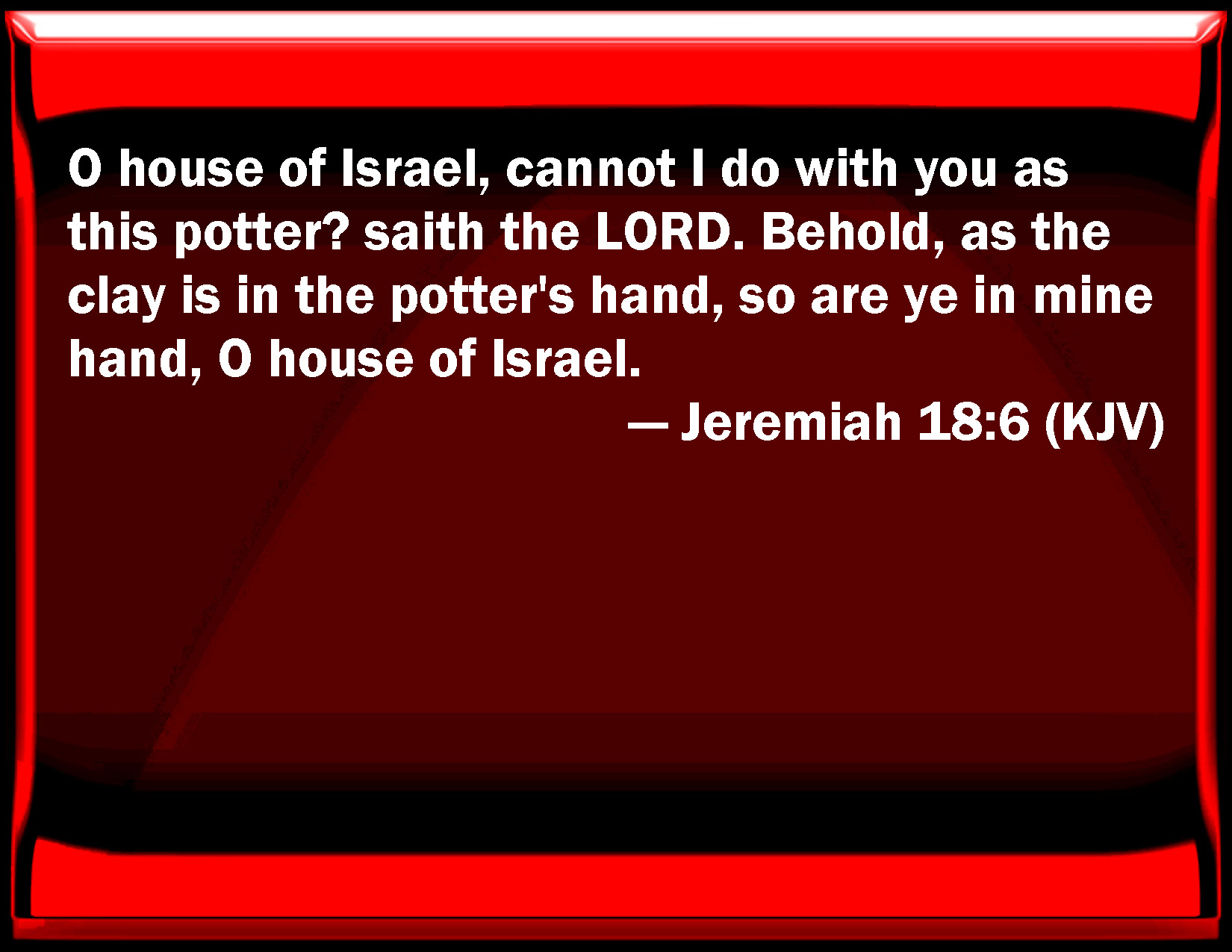 Bible Verse Slide Jeremiah 18:6 O house of Israel, cannot I do with you as this potter? said the LORD. Behold, as the clay is in the potter's hand, so are you in my hand, O house of Israel. KJV: O house of Israel, cannot I do with you as this potter? saith the LORD. Behold, as the clay is in the potter's hand, so are ye in mine hand, O house of Israel. DRB: Cannot I do with you as this potter, saith the Lord? behold as clay is in the hand of the potter, so are you in my hand, O house of Israel. DBT: House of Israel, cannot I do with you as this potter? saith Jehovah. Behold, as the clay in the potter's hand, so are ye in my hand, house of Israel. ERV: O house of Israel, cannot I do with you as this potter? saith the LORD. Behold, as the clay in the potter's hand, so are ye in mine hand, O house of Israel. WBT: O house of Israel, cannot I do with you as this potter? saith the LORD. Behold, as the clay is in the potter's hand, so are ye in my hand, O house of Israel. WEB: House of Israel, can't I do with you as this potter? says Yahweh. Behold, as the clay in the potter's hand, so are you in my hand, house of Israel. YLT: As this potter am I not able to do to you? O house of Israel, an affirmation of Jehovah. Lo, as clay in the hand of the potter, So are ye in My hand, O house of Israel.Links Jeremiah 18:6 NIV • Jeremiah 18:6 NLT • Jeremiah 18:6 ESV • Jeremiah 18:6 NASB • Jeremiah 18:6 KJV • Jeremiah 18:6 Interlinear • Jeremiah 18:6 Commentaries • Jeremiah 18:6 Parallel Texts • Jeremiah 18:6 Bible Apps • Jeremiah 18:6 Parallel • Bible Hub |
