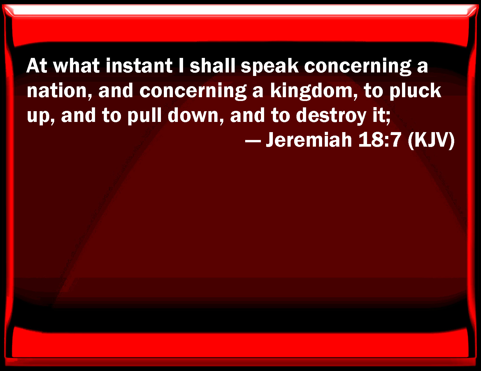 Bible Verse Slide Jeremiah 18:7 At what instant I shall speak concerning a nation, and concerning a kingdom, to pluck up, and to pull down, and to destroy it; KJV: At what instant I shall speak concerning a nation, and concerning a kingdom, to pluck up, and to pull down, and to destroy it; DRB: I will suddenly speak against a nation, and against a kingdom, to root out, and to pull down, and to destroy it. DBT: At the moment that I speak concerning a nation and concerning a kingdom, to pluck up, and to break down, and to destroy, ERV: At what instant I shall speak concerning a nation, and concerning a kingdom, to pluck up and to break down and to destroy it; WBT: At what instant I shall speak concerning a nation, and concerning a kingdom, to pluck up, and to pull down, and to destroy it; WEB: At what instant I shall speak concerning a nation, and concerning a kingdom, to pluck up and to break down and to destroy it; YLT: The moment I speak concerning a nation, And concerning a kingdom, To pluck up and to break down, and to destroy,Links Jeremiah 18:7 NIV • Jeremiah 18:7 NLT • Jeremiah 18:7 ESV • Jeremiah 18:7 NASB • Jeremiah 18:7 KJV • Jeremiah 18:7 Interlinear • Jeremiah 18:7 Commentaries • Jeremiah 18:7 Parallel Texts • Jeremiah 18:7 Bible Apps • Jeremiah 18:7 Parallel • Bible Hub |