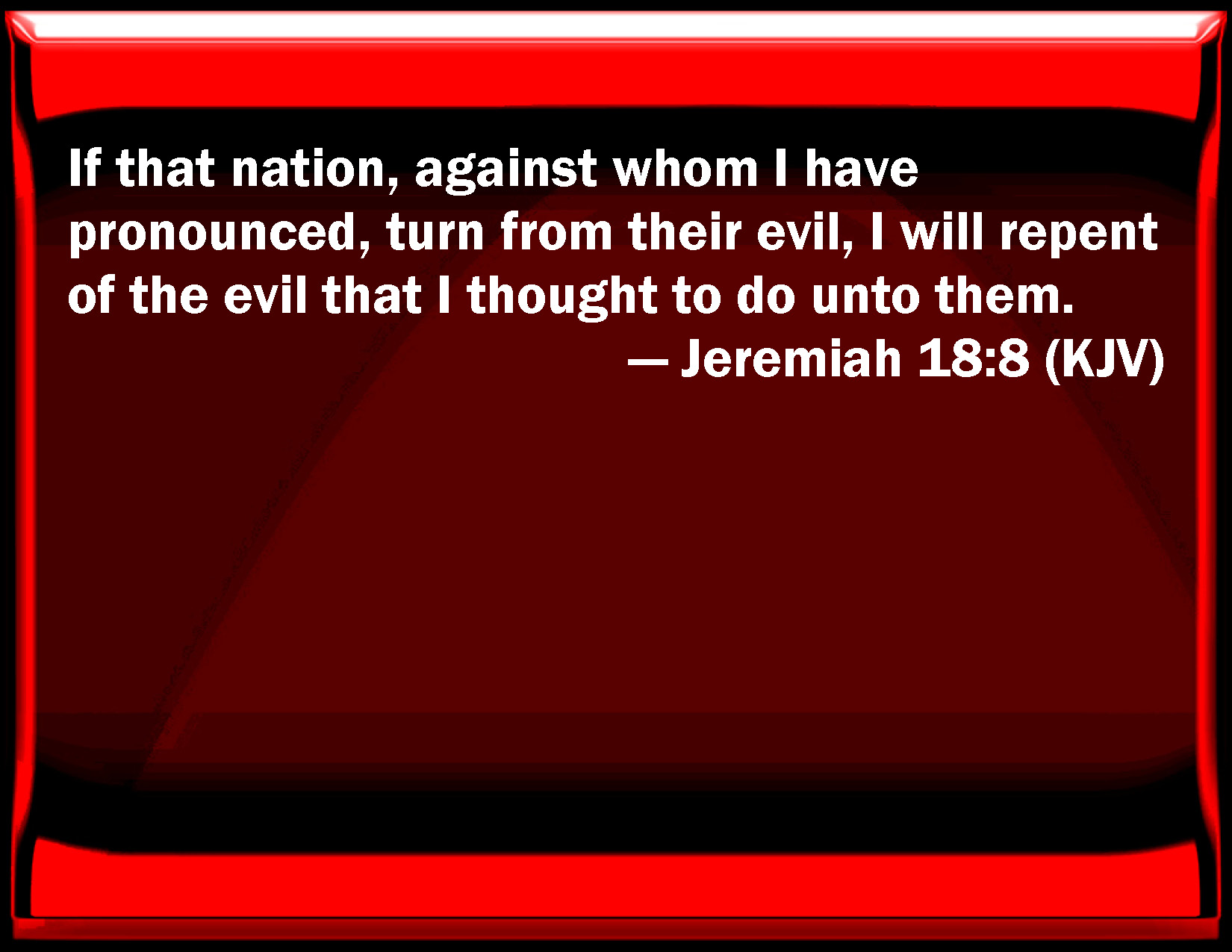 Bible Verse Slide Jeremiah 18:8 If that nation, against whom I have pronounced, turn from their evil, I will repent of the evil that I thought to do to them. KJV: If that nation, against whom I have pronounced, turn from their evil, I will repent of the evil that I thought to do unto them. DRB: If that nation against which I have spoken, shall repent of their evil, I also will repent of the evil that I have thought to do to them. DBT: if that nation, concerning which I have spoken, turn from their evil, then I will repent of the evil that I thought to do unto them. ERV: if that nation, concerning which I have spoken, turn from their evil, I will repent of the evil that I thought to do unto them. WBT: If that nation against which I have pronounced, shall turn from their evil, I will repent of the evil that I thought to do to them. WEB: if that nation, concerning which I have spoken, turn from their evil, I will repent of the evil that I thought to do to them. YLT: And that nation hath turned from its evil, Because I have spoken against it, Then I have repented of the evil that I thought to do to it.Links Jeremiah 18:8 NIV • Jeremiah 18:8 NLT • Jeremiah 18:8 ESV • Jeremiah 18:8 NASB • Jeremiah 18:8 KJV • Jeremiah 18:8 Interlinear • Jeremiah 18:8 Commentaries • Jeremiah 18:8 Parallel Texts • Jeremiah 18:8 Bible Apps • Jeremiah 18:8 Parallel • Bible Hub |