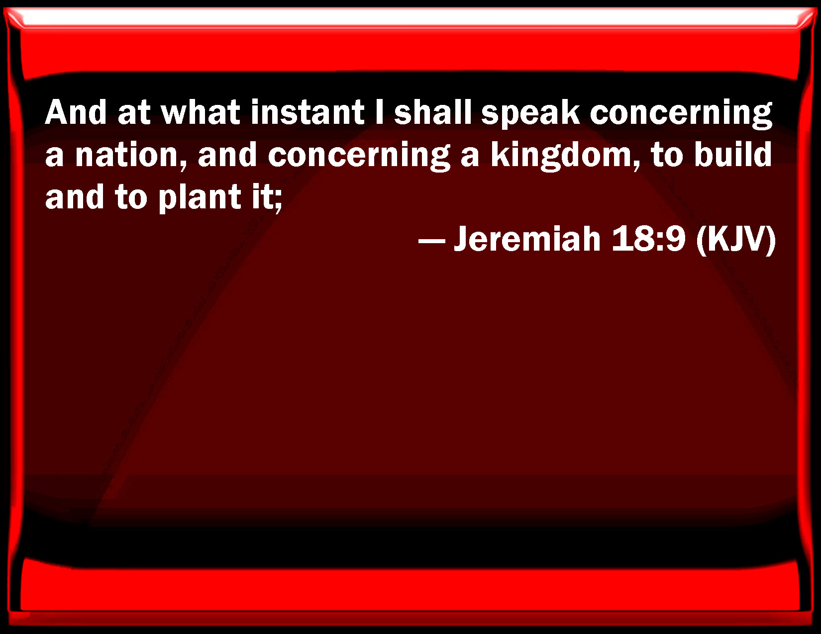 Bible Verse Slide Jeremiah 18:9 And at what instant I shall speak concerning a nation, and concerning a kingdom, to build and to plant it; KJV: And at what instant I shall speak concerning a nation, and concerning a kingdom, to build and to plant it; DRB: And I will suddenly speak of a nation and of a kingdom, to build up and plant it. DBT: And at the moment that I speak concerning a nation and concerning a kingdom, to build and to plant, ERV: And at what instant I shall speak concerning a nation, and concerning a kingdom, to build and to plant it; WBT: And at what instant I shall speak concerning a nation, and concerning a kingdom, to build and to plant it; WEB: At what instant I shall speak concerning a nation, and concerning a kingdom, to build and to plant it; YLT: And the moment I speak concerning a nation, And concerning a kingdom, to build, and to plant,Links Jeremiah 18:9 NIV • Jeremiah 18:9 NLT • Jeremiah 18:9 ESV • Jeremiah 18:9 NASB • Jeremiah 18:9 KJV • Jeremiah 18:9 Interlinear • Jeremiah 18:9 Commentaries • Jeremiah 18:9 Parallel Texts • Jeremiah 18:9 Bible Apps • Jeremiah 18:9 Parallel • Bible Hub |