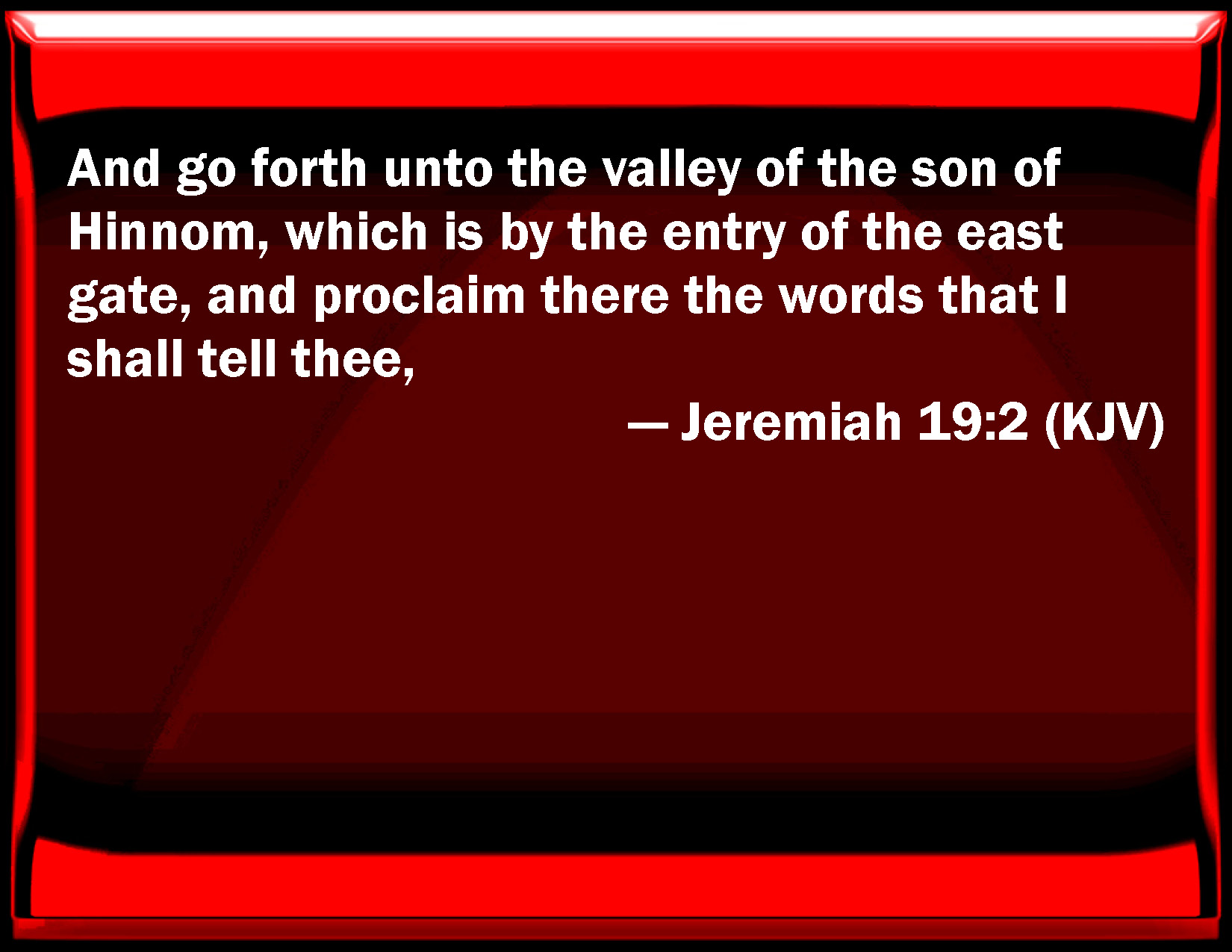 Bible Verse Slide Jeremiah 19:2 And go forth to the valley of the son of Hinnom, which is by the entry of the east gate, and proclaim there the words that I shall tell you, KJV: And go forth unto the valley of the son of Hinnom, which is by the entry of the east gate, and proclaim there the words that I shall tell thee, DRB: And go forth into the valley of the son of Ennom, which is by the entry of the earthen gate: and there thou shalt proclaim the words that I shall tell thee. DBT: and go forth unto the valley of the son of Hinnom, which is by the entry of the pottery-gate, and proclaim there the words that I shall tell thee, ERV: and go forth unto the valley of the son of Hinnom, which is by the entry of the gate Harsith, and proclaim there the words that I shall tell thee: WBT: And go forth to the valley of the son of Hinnom, which is by the entry of the east gate, and proclaim there the words that I shall tell thee, WEB: and go forth to the valley of the son of Hinnom, which is by the entry of the gate Harsith, and proclaim there the words that I shall tell you; YLT: and thou hast gone forth unto the valley of the son of Hinnom, that is at the opening of the gate of the pottery, and hast proclaimed there the words that I speak unto thee,Links Jeremiah 19:2 NIV • Jeremiah 19:2 NLT • Jeremiah 19:2 ESV • Jeremiah 19:2 NASB • Jeremiah 19:2 KJV • Jeremiah 19:2 Interlinear • Jeremiah 19:2 Commentaries • Jeremiah 19:2 Parallel Texts • Jeremiah 19:2 Bible Apps • Jeremiah 19:2 Parallel • Bible Hub |