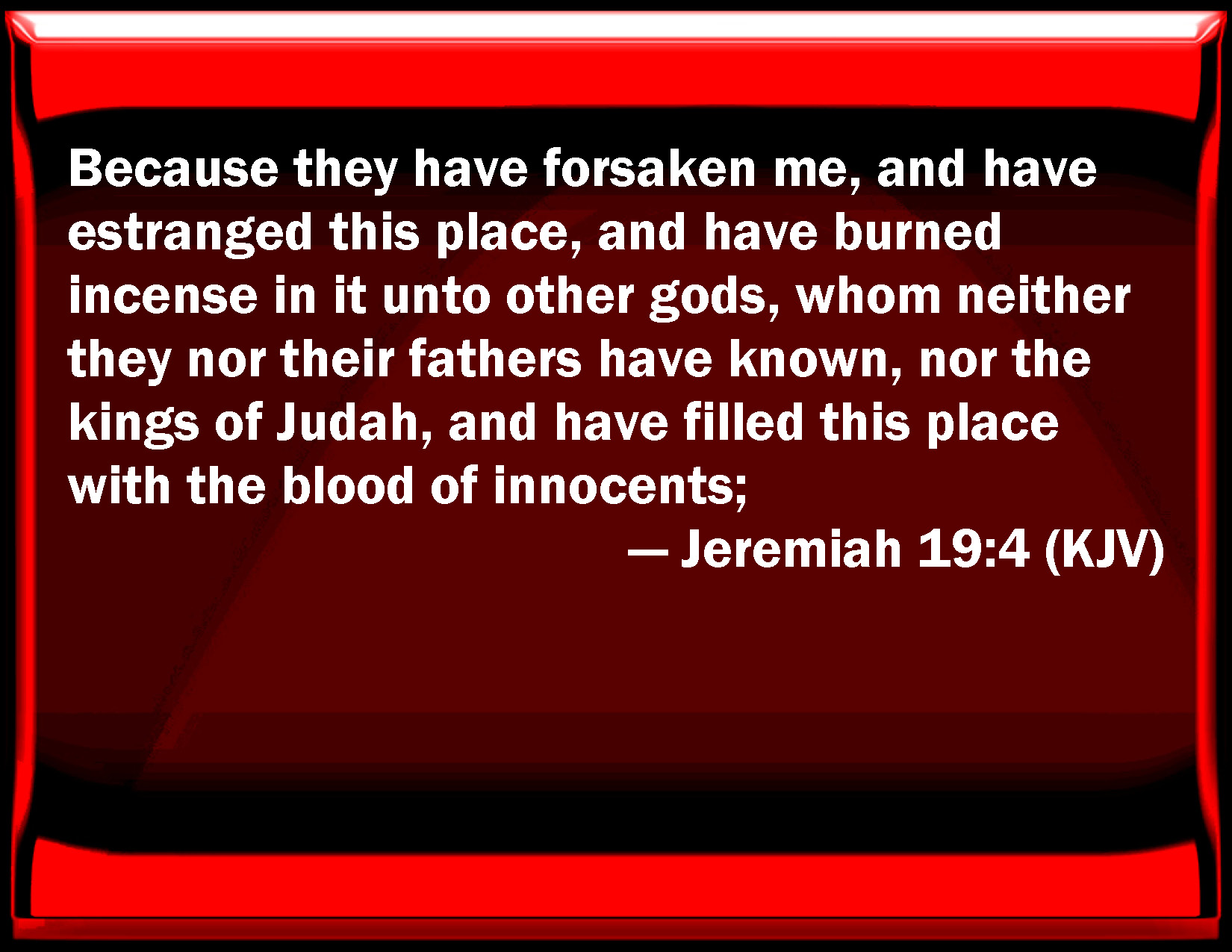 Bible Verse Slide Jeremiah 19:4 Because they have forsaken me, and have estranged this place, and have burned incense in it to other gods, whom neither they nor their fathers have known, nor the kings of Judah, and have filled this place with the blood of innocents; KJV: Because they have forsaken me, and have estranged this place, and have burned incense in it unto other gods, whom neither they nor their fathers have known, nor the kings of Judah, and have filled this place with the blood of innocents; DRB: Because they have forsaken me, and have profaned this place: and have sacrificed therein to strange gods, whom neither they nor their fathers knew, nor the kings of Juda: and they have filled this place with the blood of innocents. DBT: because they have forsaken me, and have estranged this place from me, and have burned incense in it unto other gods, whom neither they nor their fathers have known, nor the kings of Judah; and have filled this place with the blood of innocents; ERV: Because they have forsaken me, and have estranged this place, and have burned incense in it unto other gods, whom they knew not, they and their fathers and the kings of Judah; and have filled this place with the blood of innocents; WBT: Because they have forsaken me, and have estranged this place, and have burned incense in it to other gods, whom neither they nor their fathers have known, nor the kings of Judah, and have filled this place with the blood of innocents; WEB: Because they have forsaken me, and have estranged this place, and have burned incense in it to other gods, that they didn't know, they and their fathers and the kings of Judah; and have filled this place with the blood of innocents, YLT: because that they have forsaken Me, and make known this place, and make perfume in it to other gods, that they knew not, they and their fathers, and the kings of Judah, and they have filled this place with innocent blood,Links Jeremiah 19:4 NIV • Jeremiah 19:4 NLT • Jeremiah 19:4 ESV • Jeremiah 19:4 NASB • Jeremiah 19:4 KJV • Jeremiah 19:4 Interlinear • Jeremiah 19:4 Commentaries • Jeremiah 19:4 Parallel Texts • Jeremiah 19:4 Bible Apps • Jeremiah 19:4 Parallel • Bible Hub |
