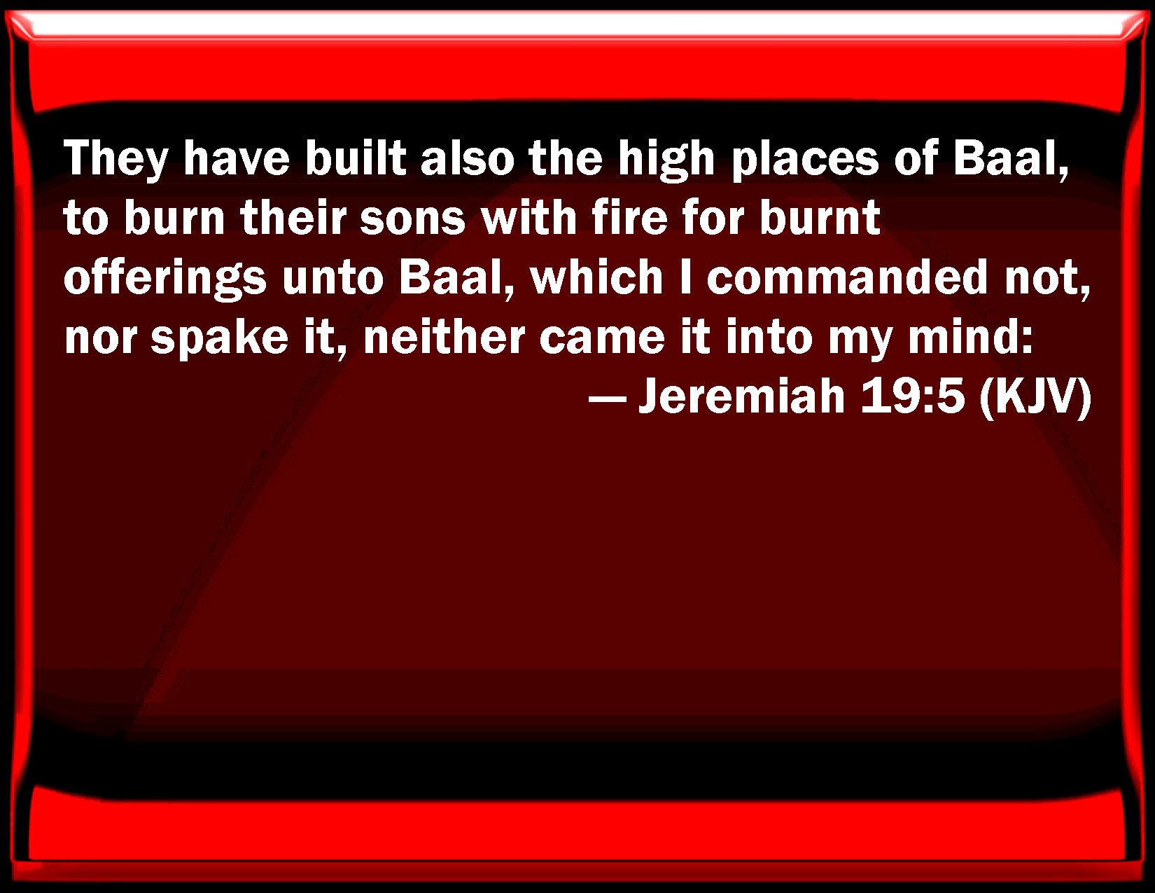 Bible Verse Slide Jeremiah 19:5 They have built also the high places of Baal, to burn their sons with fire for burnt offerings to Baal, which I commanded not, nor spoke it, neither came it into my mind: KJV: They have built also the high places of Baal, to burn their sons with fire for burnt offerings unto Baal, which I commanded not, nor spake it, neither came it into my mind: DRB: And they have built the high places of Baalim, to burn their children with fire for a holocaust to Baalim: which I did not command, nor speak of, neither did it once come into my mind. DBT: and they have built the high places of Baal, to burn their sons in the fire as burnt-offerings unto Baal, which I commanded not, nor spake it, neither came it up into my mind: ERV: and have built the high places of Baal, to burn their sons in the fire for burnt offerings unto Baal; which I commanded not, nor spake it, neither came it into my mind: WBT: They have built also the high places of Baal, to burn their sons with fire for burnt-offerings to Baal, which I commanded not, nor spoke it, neither came it into my mind: WEB: and have built the high places of Baal, to burn their sons in the fire for burnt offerings to Baal; which I didn't command, nor spoke it, neither came it into my mind: YLT: and have built the high places of Baal to burn their sons with fire, burnt-offerings to Baal, that I commanded not, nor spake of, nor did it come up on My heart.Links Jeremiah 19:5 NIV • Jeremiah 19:5 NLT • Jeremiah 19:5 ESV • Jeremiah 19:5 NASB • Jeremiah 19:5 KJV • Jeremiah 19:5 Interlinear • Jeremiah 19:5 Commentaries • Jeremiah 19:5 Parallel Texts • Jeremiah 19:5 Bible Apps • Jeremiah 19:5 Parallel • Bible Hub |