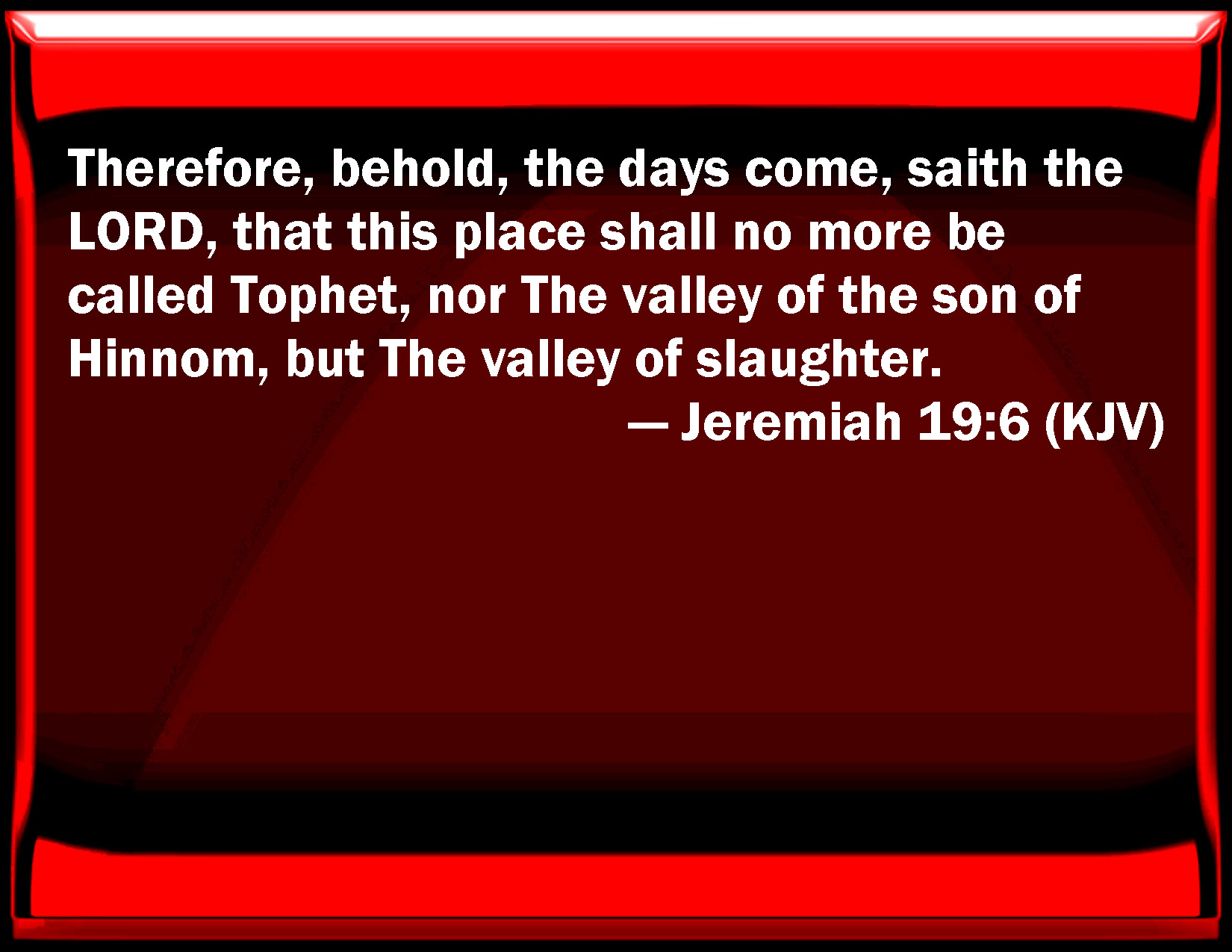 Bible Verse Slide Jeremiah 19:6 Therefore, behold, the days come, said the LORD, that this place shall no more be called Tophet, nor The valley of the son of Hinnom, but The valley of slaughter. KJV: Therefore, behold, the days come, saith the LORD, that this place shall no more be called Tophet, nor The valley of the son of Hinnom, but The valley of slaughter. DRB: Therefore behold the days come, saith the Lord, that this place shall no more be called Topheth, nor the valley of the son of Ennom, but the valley of slaughter. DBT: therefore behold, days come, saith Jehovah, that this place shall no more be called Topheth, nor Valley of the son of Hinnom, but the valley of slaughter. ERV: therefore, behold, the days come, saith the LORD, that this place shall no more be called Topheth, nor The valley of the son of Hinnom, but The valley of Slaughter. WBT: Therefore behold, the days come, saith the LORD, that this place shall no more be called Tophet, nor The valley of the son of Hinnom, but The valley of slaughter. WEB: therefore, behold, the days come, says Yahweh, that this place shall no more be called Topheth, nor The valley of the son of Hinnom, but The valley of Slaughter. YLT: Therefore, lo, days are coming — an affirmation of Jehovah — and this place is not called any more, Tophet, and Valley of the son of Hinnom, but, Valley of slaughter.Links Jeremiah 19:6 NIV • Jeremiah 19:6 NLT • Jeremiah 19:6 ESV • Jeremiah 19:6 NASB • Jeremiah 19:6 KJV • Jeremiah 19:6 Interlinear • Jeremiah 19:6 Commentaries • Jeremiah 19:6 Parallel Texts • Jeremiah 19:6 Bible Apps • Jeremiah 19:6 Parallel • Bible Hub |