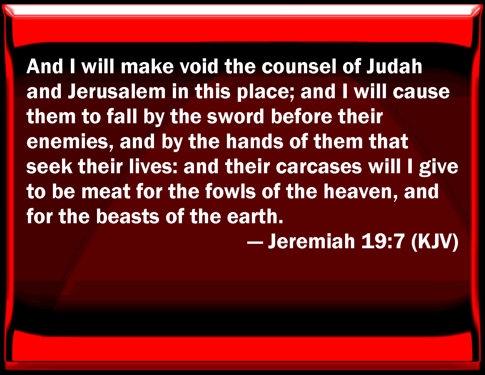 And I will make void the counsel of Judah and Jerusalem in this place; and I will cause them to fall by the sword before their enemies, and by the hands of them that seek their lives: and their carcasses will I give to be food for the fowls of the heaven, and for the beasts of the earth.