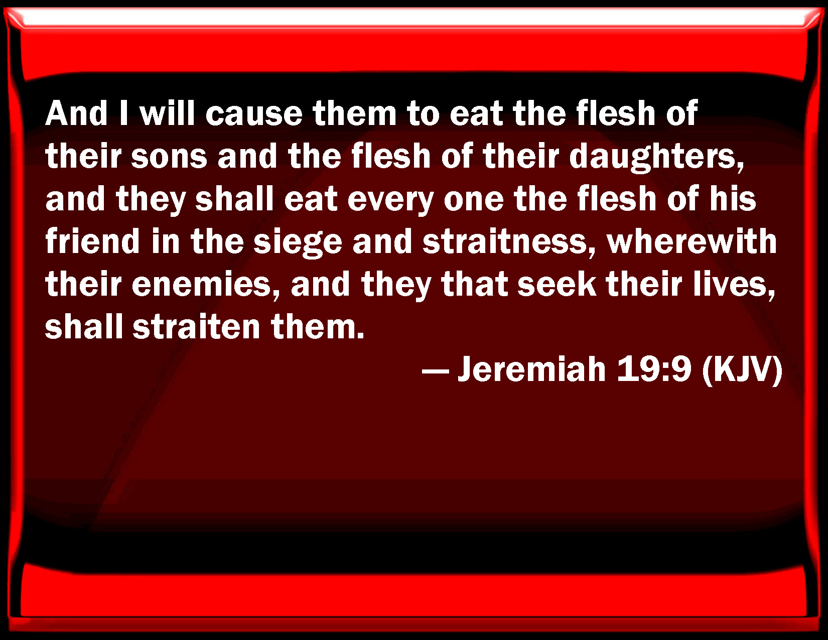 Bible Verse Slide Jeremiah 19:9 And I will cause them to eat the flesh of their sons and the flesh of their daughters, and they shall eat every one the flesh of his friend in the siege and narrow place, with which their enemies, and they that seek their lives, shall straiten them. KJV: And I will cause them to eat the flesh of their sons and the flesh of their daughters, and they shall eat every one the flesh of his friend in the siege and straitness, wherewith their enemies, and they that seek their lives, shall straiten them. DRB: And I will feed them with the flesh of their sons, and with the flesh of their daughters: and they shall eat every one the flesh of his friend in the siege, and in the distress wherewith their enemies, and they that seek their lives shall straiten them. DBT: And I will cause them to eat the flesh of their sons and the flesh of their daughters, and they shall eat everyone the flesh of his friend, in the siege and in the straitness wherewith their enemies, and they that seek their lives, shall straiten them. ERV: And I will cause them to eat the flesh of their sons and the flesh of their daughters, and they shall eat every one the flesh of his friend, in the siege and in the straitness, wherewith their enemies, and they that seek their life, shall straiten them. WBT: And I will cause them to eat the flesh of their sons and the flesh of their daughters, and they shall eat every one the flesh of his friend in the siege and distress with which their enemies, and they that seek their lives, shall distress them. WEB: I will cause them to eat the flesh of their sons and the flesh of their daughters; and they shall eat everyone the flesh of his friend, in the siege and in the distress, with which their enemies, and those who seek their life, shall distress them. YLT: And I have caused them to eat the flesh of their sons, and the flesh of their daughters, and each the flesh of his friend they do eat, in the siege and in the straitness with which straiten them do their enemies, and those seeking their life.Links Jeremiah 19:9 NIV • Jeremiah 19:9 NLT • Jeremiah 19:9 ESV • Jeremiah 19:9 NASB • Jeremiah 19:9 KJV • Jeremiah 19:9 Interlinear • Jeremiah 19:9 Commentaries • Jeremiah 19:9 Parallel Texts • Jeremiah 19:9 Bible Apps • Jeremiah 19:9 Parallel • Bible Hub |