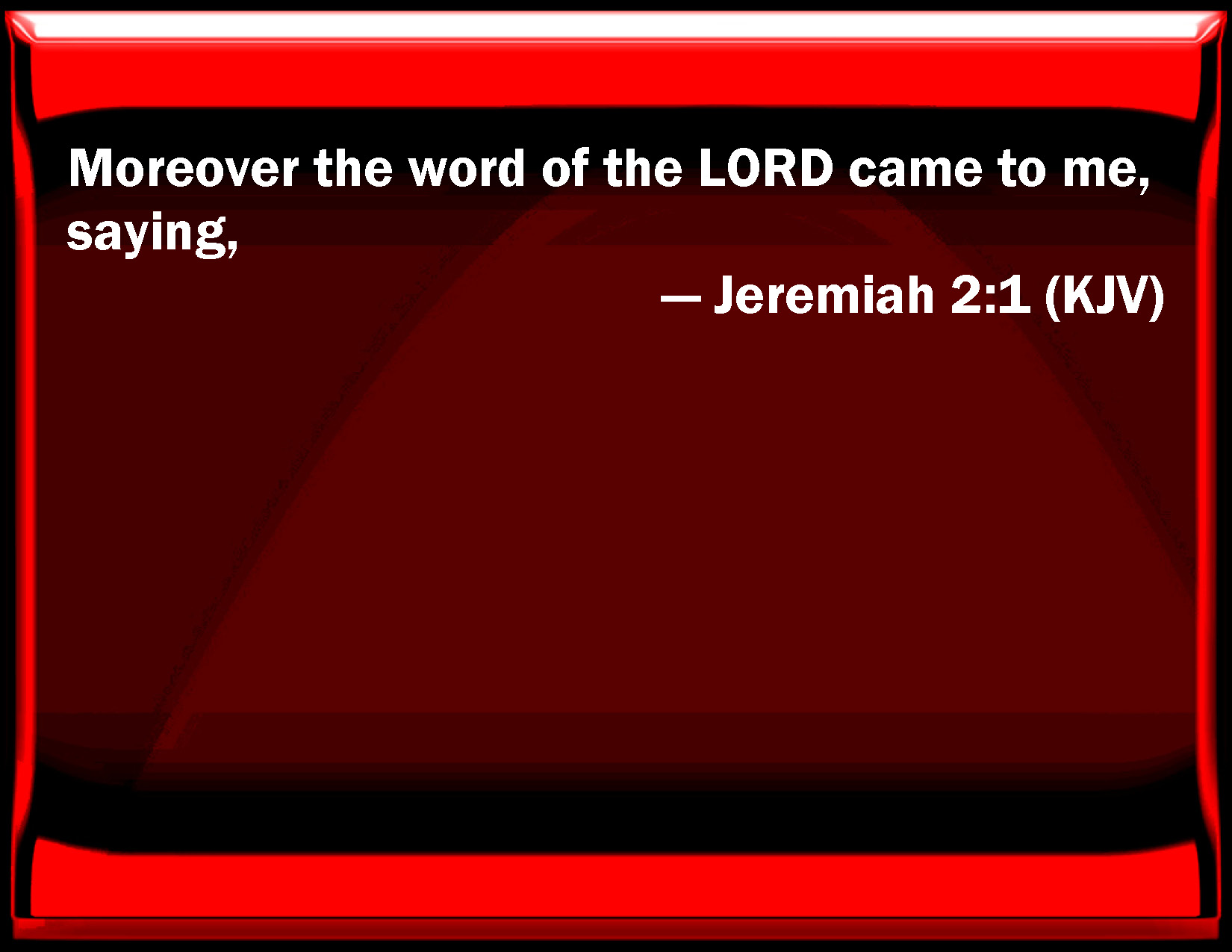 Bible Verse Slide Jeremiah 2:1 Moreover the word of the LORD came to me, saying, KJV: Moreover the word of the LORD came to me, saying, DRB: And the word of the Lord came to me, saying: DBT: And the word of Jehovah came to me, saying, ERV: And the word of the LORD came to me, saying, WBT: Moreover the word of the LORD came to me, saying, WEB: The word of Yahweh came to me, saying, YLT: And there is a word of Jehovah unto me, saying,Links Jeremiah 2:1 NIV • Jeremiah 2:1 NLT • Jeremiah 2:1 ESV • Jeremiah 2:1 NASB • Jeremiah 2:1 KJV • Jeremiah 2:1 Interlinear • Jeremiah 2:1 Commentaries • Jeremiah 2:1 Parallel Texts • Jeremiah 2:1 Bible Apps • Jeremiah 2:1 Parallel • Bible Hub |
