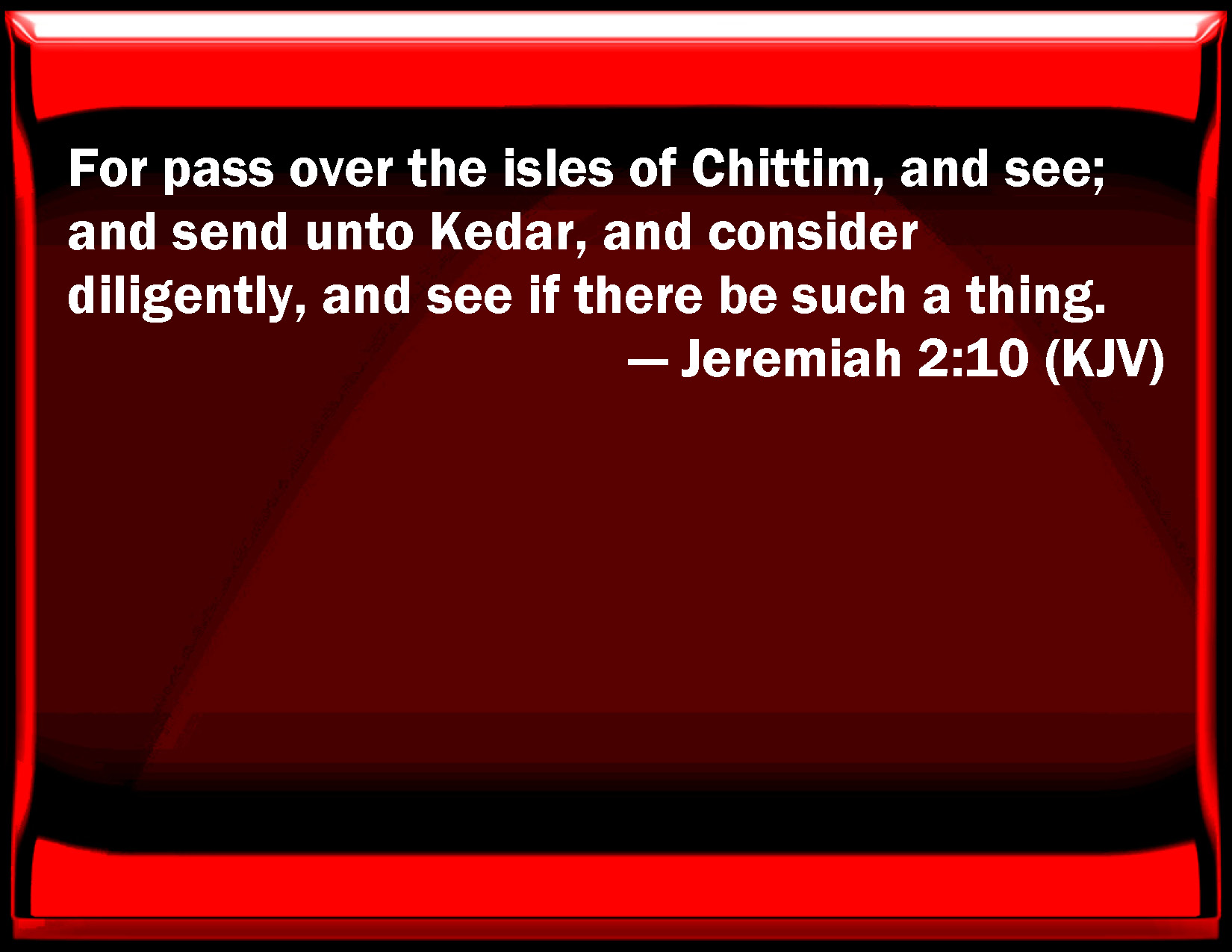 Bible Verse Slide Jeremiah 2:10 For pass over the isles of Chittim, and see; and send to Kedar, and consider diligently, and see if there be such a thing. KJV: For pass over the isles of Chittim, and see; and send unto Kedar, and consider diligently, and see if there be such a thing. DRB: Pass over to the isles of Cethim, and see: and send into Cedar, and consider diligently: and see if there hath been done any thing like this. DBT: For pass over to the isles of Chittim, and see; and send unto Kedar, and consider diligently, and see if there have been such a thing. ERV: For pass over to the isles of Kittim, and see; and send unto Kedar, and consider diligently; and see if there hath been such a thing. WBT: For pass over the isles of Chittim, and see; and send to Kedar, and consider diligently, and see if there is such a thing. WEB: For pass over to the islands of Kittim, and see; and send to Kedar, and consider diligently; and see if there has been such a thing. YLT: For, pass to the isles of Chittim, and see, And to Kedar send, and consider well, And see if there hath been like this:Links Jeremiah 2:10 NIV • Jeremiah 2:10 NLT • Jeremiah 2:10 ESV • Jeremiah 2:10 NASB • Jeremiah 2:10 KJV • Jeremiah 2:10 Interlinear • Jeremiah 2:10 Commentaries • Jeremiah 2:10 Parallel Texts • Jeremiah 2:10 Bible Apps • Jeremiah 2:10 Parallel • Bible Hub |
