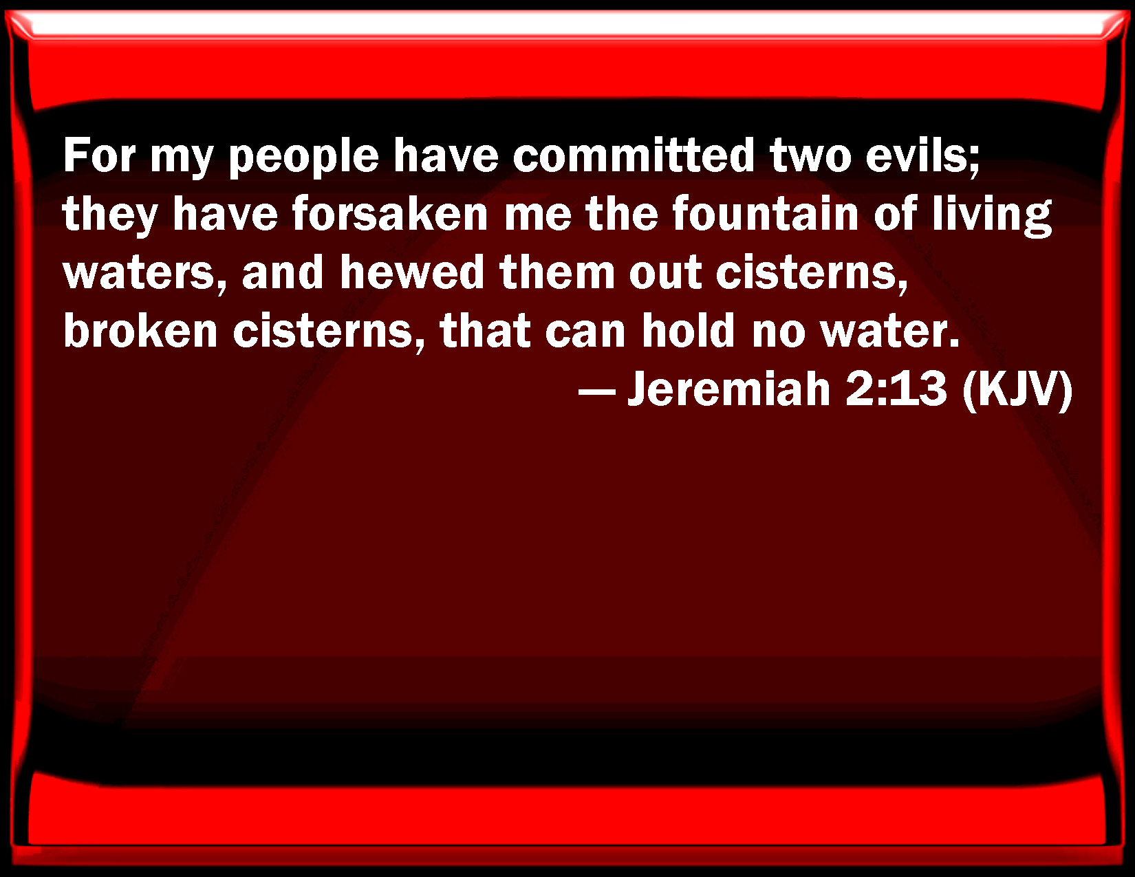 Bible Verse Slide Jeremiah 2:13 For my people have committed two evils; they have forsaken me the fountain of living waters, and hewed them out cisterns, broken cisterns, that can hold no water. KJV: For my people have committed two evils; they have forsaken me the fountain of living waters, and hewed them out cisterns, broken cisterns, that can hold no water. DRB: For my people have done two evils. They have forsaken me, the fountain of living water, and have digged to themselves cisterns, broken cisterns, that can hold no water. DBT: For my people have committed two evils: they have forsaken me, the fountain of living waters, to hew them out cisterns, broken cisterns that hold no water. ERV: For my people have committed two evils; they have forsaken me the fountain of living waters, and hewed them out cisterns, broken cisterns, that can hold no water. WBT: For my people have committed two evils; they have forsaken me the fountain of living waters, and hewed out for themselves cisterns, broken cisterns, that can hold no water. WEB: "For my people have committed two evils: they have forsaken me, the spring of living waters, and cut them out cisterns, broken cisterns, that can hold no water. YLT: For two evils hath My people done, Me they have forsaken, a fountain of living waters, To hew out for themselves wells — broken wells, That contain not the waters.Links Jeremiah 2:13 NIV • Jeremiah 2:13 NLT • Jeremiah 2:13 ESV • Jeremiah 2:13 NASB • Jeremiah 2:13 KJV • Jeremiah 2:13 Interlinear • Jeremiah 2:13 Commentaries • Jeremiah 2:13 Parallel Texts • Jeremiah 2:13 Bible Apps • Jeremiah 2:13 Parallel • Bible Hub |