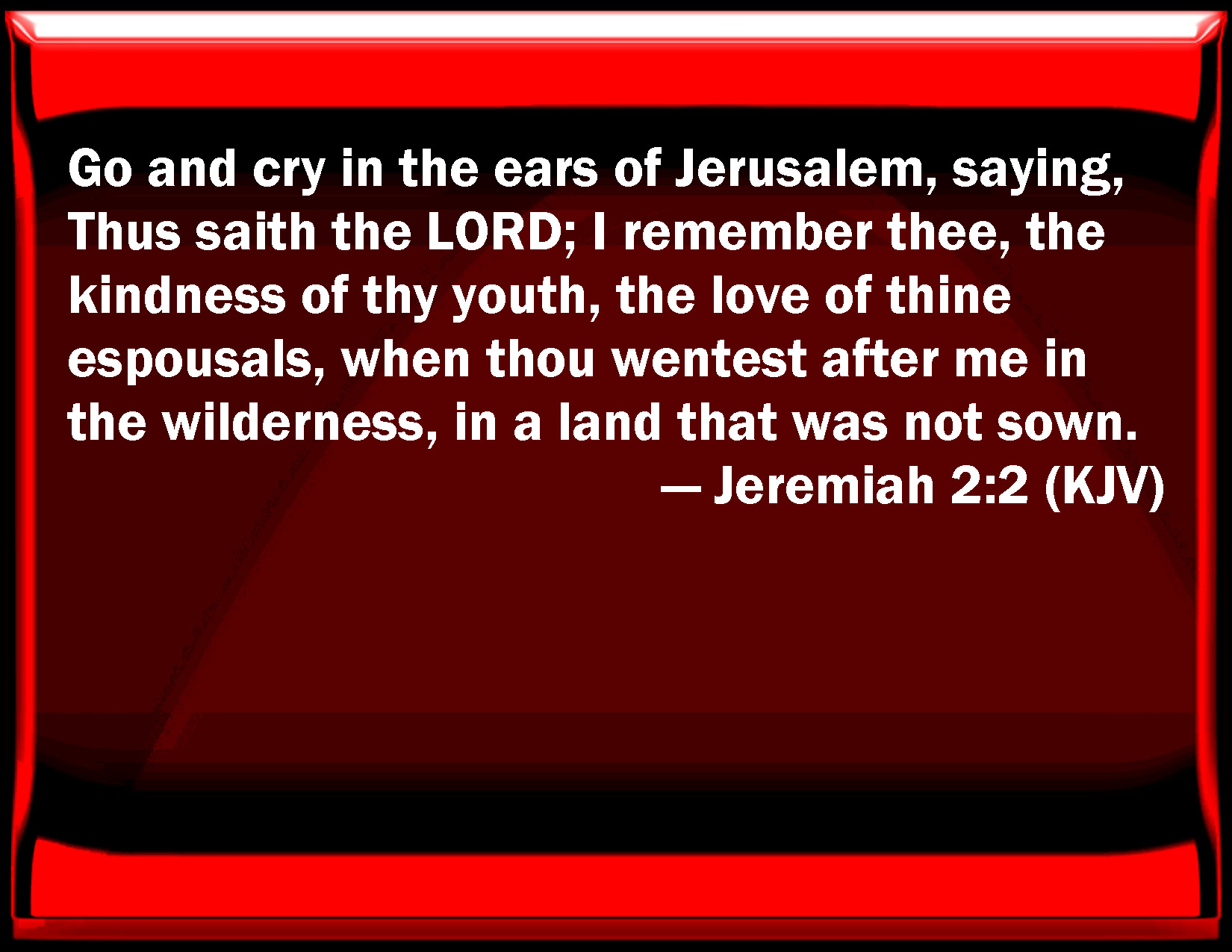 Bible Verse Slide Jeremiah 2:2 Go and cry in the ears of Jerusalem, saying, Thus said the LORD; I remember you, the kindness of your youth, the love of your espousals, when you went after me in the wilderness, in a land that was not sown. KJV: Go and cry in the ears of Jerusalem, saying, Thus saith the LORD; I remember thee, the kindness of thy youth, the love of thine espousals, when thou wentest after me in the wilderness, in a land that was not sown. DRB: Go, and cry in the ears of Jerusalem, saying: Thus saith the Lord: I have remembered thee, pitying thy soul, pitying thy youth, and the love of thy espousals, when thou followedst me in the desert, in a land that is not sown. DBT: Go and cry in the ears of Jerusalem, saying, Thus saith Jehovah: I remember for thee the kindness of thy youth, the love of thine espousals, when thou wentest after me in the wilderness, in a land not sown. ERV: Go, and cry in the ears of Jerusalem, saying, Thus saith the LORD, I remember for thee the kindness of thy youth, the love of thine espousals; how thou wentest after me in the wilderness, in a land that was not sown. WBT: Go, and cry in the ears of Jerusalem, saying, Thus saith the LORD; I remember thee, the kindness of thy youth, the love of thy espousals, when thou wentest after me in the wilderness, in a land that was not sown. WEB: "Go, and cry in the ears of Jerusalem, saying, 'Thus says Yahweh, "I remember for you the kindness of your youth, the love of your weddings; how you went after me in the wilderness, in a land that was not sown. YLT: 'Go, and thou hast called in the ears of Jerusalem, saying, Thus said Jehovah: I have remembered for thee The kindness of thy youth, the love of thine espousals, Thy going after Me in a wilderness, in a land not sown.Links Jeremiah 2:2 NIV • Jeremiah 2:2 NLT • Jeremiah 2:2 ESV • Jeremiah 2:2 NASB • Jeremiah 2:2 KJV • Jeremiah 2:2 Interlinear • Jeremiah 2:2 Commentaries • Jeremiah 2:2 Parallel Texts • Jeremiah 2:2 Bible Apps • Jeremiah 2:2 Parallel • Bible Hub |