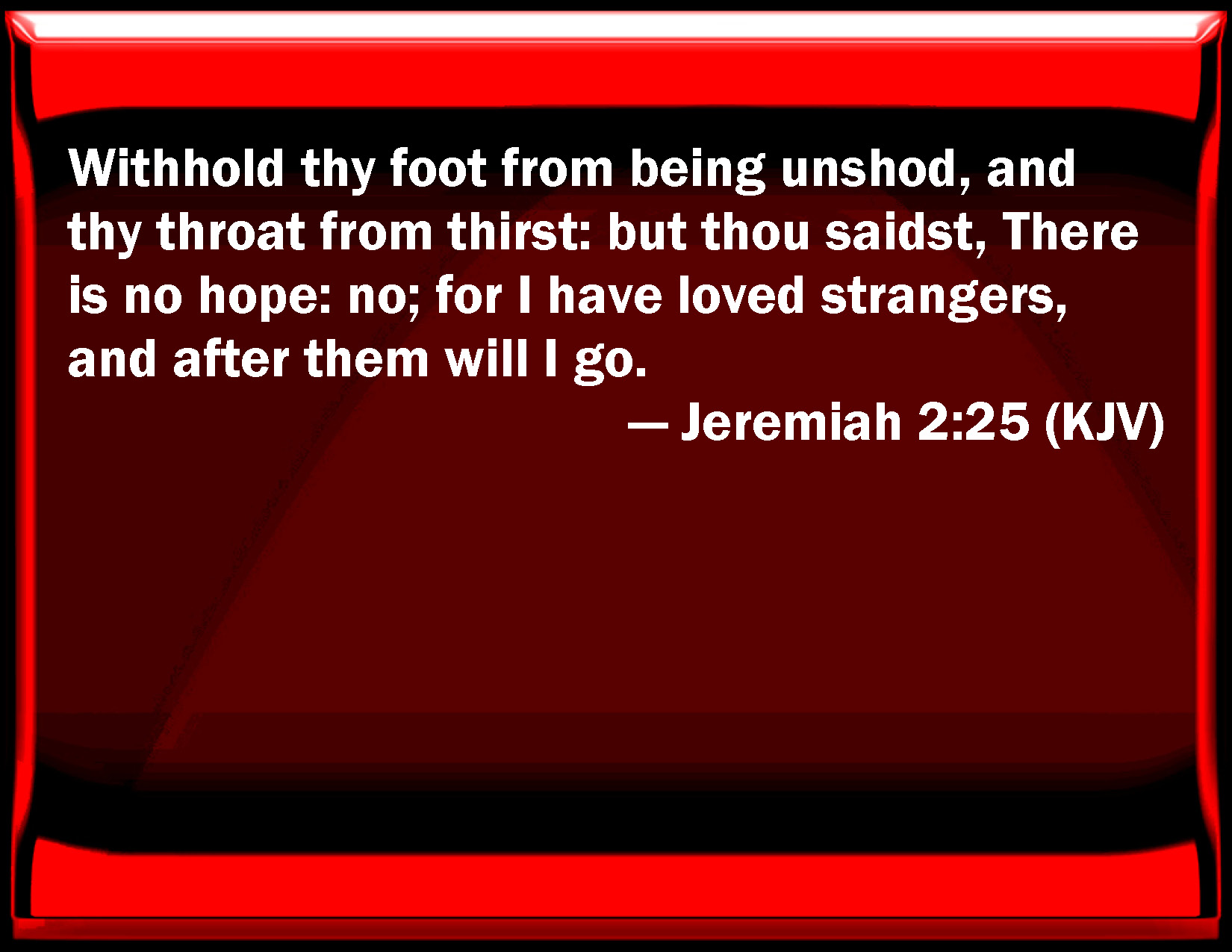 Bible Verse Slide Jeremiah 2:25 Withhold your foot from being unshod, and your throat from thirst: but you said, There is no hope: no; for I have loved strangers, and after them will I go. KJV: Withhold thy foot from being unshod, and thy throat from thirst: but thou saidst, There is no hope: no; for I have loved strangers, and after them will I go. DRB: Keep thy foot from being bare, and thy throat from thirst. But thou saidst: I have lost all hope, I will not do it: for I have loved strangers, and I will walk after them. DBT: Withhold thy foot from being unshod, and thy throat from thirst. But thou saidst, There is no hope; no, for I love strangers, and after them will I go. ERV: Withhold thy foot from being unshod, and thy throat from thirst: but thou saidst, There is no hope: no; for I have loved strangers, and after them will I go. WBT: Withhold thy foot from being unshod, and thy throat from thirst: but thou saidst, There is no hope: no; for I have loved strangers, and after them will I go. WEB: "Withhold your foot from being unshod, and your throat from thirst. But you said, 'It is in vain. No, for I have loved strangers, and I will go after them.' YLT: Withhold thy foot from being unshod, And thy throat from thirst, And thou sayest, 'It is incurable, No, for I have loved strangers, and after them I go.'Links Jeremiah 2:25 NIV • Jeremiah 2:25 NLT • Jeremiah 2:25 ESV • Jeremiah 2:25 NASB • Jeremiah 2:25 KJV • Jeremiah 2:25 Interlinear • Jeremiah 2:25 Commentaries • Jeremiah 2:25 Parallel Texts • Jeremiah 2:25 Bible Apps • Jeremiah 2:25 Parallel • Bible Hub |
