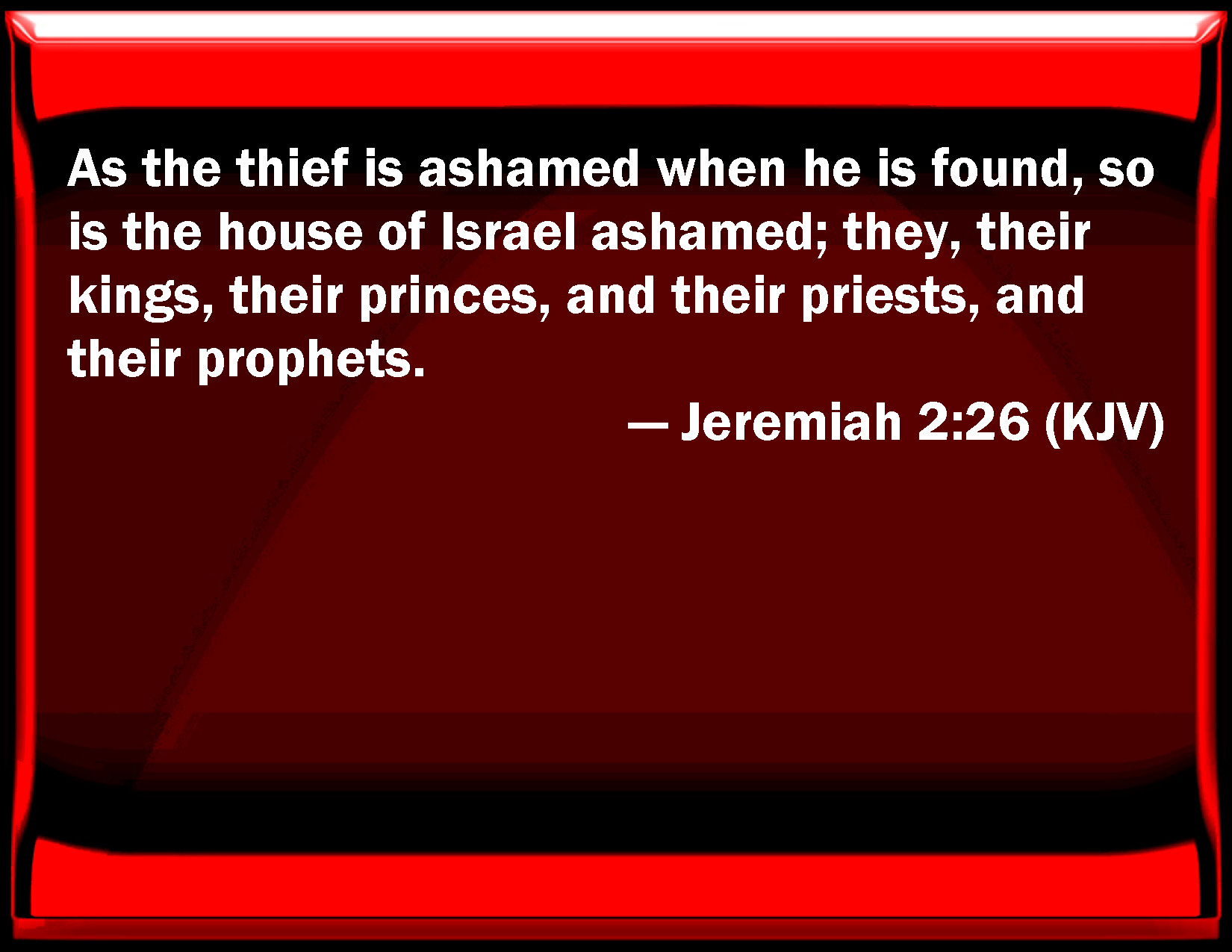 Bible Verse Slide Jeremiah 2:26 As the thief is ashamed when he is found, so is the house of Israel ashamed; they, their kings, their princes, and their priests, and their prophets. KJV: As the thief is ashamed when he is found, so is the house of Israel ashamed; they, their kings, their princes, and their priests, and their prophets, DRB: As the thief is confounded when he is taken, so is the house of Israel confounded, they and their kings, their princes and their priests, and their prophets. DBT: As a thief is ashamed when he is found, so shall the house of Israel be ashamed they, their kings, their princes, and their priests, and their prophets — ERV: As the thief is ashamed when he is found, so is the house of Israel ashamed; they, their kings, their princes, and their priests, and their prophets; WBT: As the thief is ashamed when he is found, so is the house of Israel ashamed: they, their kings, their princes, and their priests, and their prophets, WEB: As the thief is ashamed when he is found, so is the house of Israel ashamed; they, their kings, their princes, and their priests, and their prophets; YLT: As the shame of a thief when he is found, So put to shame have been the house of Israel, They, their kings, their heads, And their priests, and their prophets,Links Jeremiah 2:26 NIV • Jeremiah 2:26 NLT • Jeremiah 2:26 ESV • Jeremiah 2:26 NASB • Jeremiah 2:26 KJV • Jeremiah 2:26 Interlinear • Jeremiah 2:26 Commentaries • Jeremiah 2:26 Parallel Texts • Jeremiah 2:26 Bible Apps • Jeremiah 2:26 Parallel • Bible Hub |