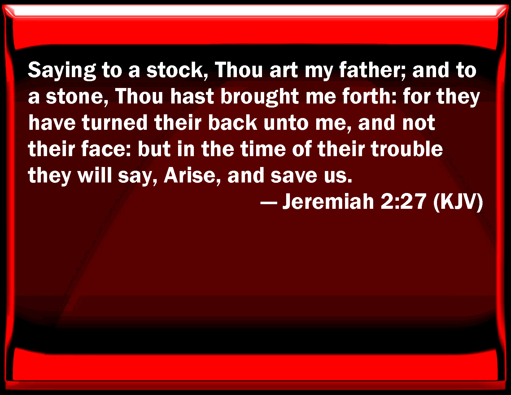 Bible Verse Slide Jeremiah 2:27 Saying to a stock, You are my father; and to a stone, You have brought me forth: for they have turned their back to me, and not their face: but in the time of their trouble they will say, Arise, and save us. KJV: Saying to a stock, Thou art my father; and to a stone, Thou hast brought me forth: for they have turned their back unto me, and not their face: but in the time of their trouble they will say, Arise, and save us. DRB: Saying to a stock: Thou art my father: and to a stone: thou hast begotten me: they have turned their back to me, and not their face: and in the time of their affliction they will say: Arise, and deliver us. DBT: saying to a stock, Thou art my father; and to a stone, Thou hast brought me forth; for they have turned the back unto me, and not the face; and in the time of their trouble they will say, Arise, and save us! ERV: which say to a stock, Thou art my father; and to a stone, Thou hast brought me forth: for they have turned their back unto me, and not their face: but in the time of their trouble they will say, Arise, and save us. WBT: Saying to a stock, Thou art my father; and to a stone, Thou hast brought me forth: for they have turned their back to me, and not their face: but in the time of their trouble they will say, Arise, and save us. WEB: who tell wood, 'You are my father;' and a stone, 'You have brought me out:' for they have turned their back to me, and not their face; but in the time of their trouble they will say, 'Arise, and save us.' YLT: Saying to wood, 'My father art thou!' And to a stone, 'Thou hast brought me forth,' For they turned unto me the back and not the face, And in the time of their vexation, They say, 'Arise Thou, and save us.'Links Jeremiah 2:27 NIV • Jeremiah 2:27 NLT • Jeremiah 2:27 ESV • Jeremiah 2:27 NASB • Jeremiah 2:27 KJV • Jeremiah 2:27 Interlinear • Jeremiah 2:27 Commentaries • Jeremiah 2:27 Parallel Texts • Jeremiah 2:27 Bible Apps • Jeremiah 2:27 Parallel • Bible Hub |