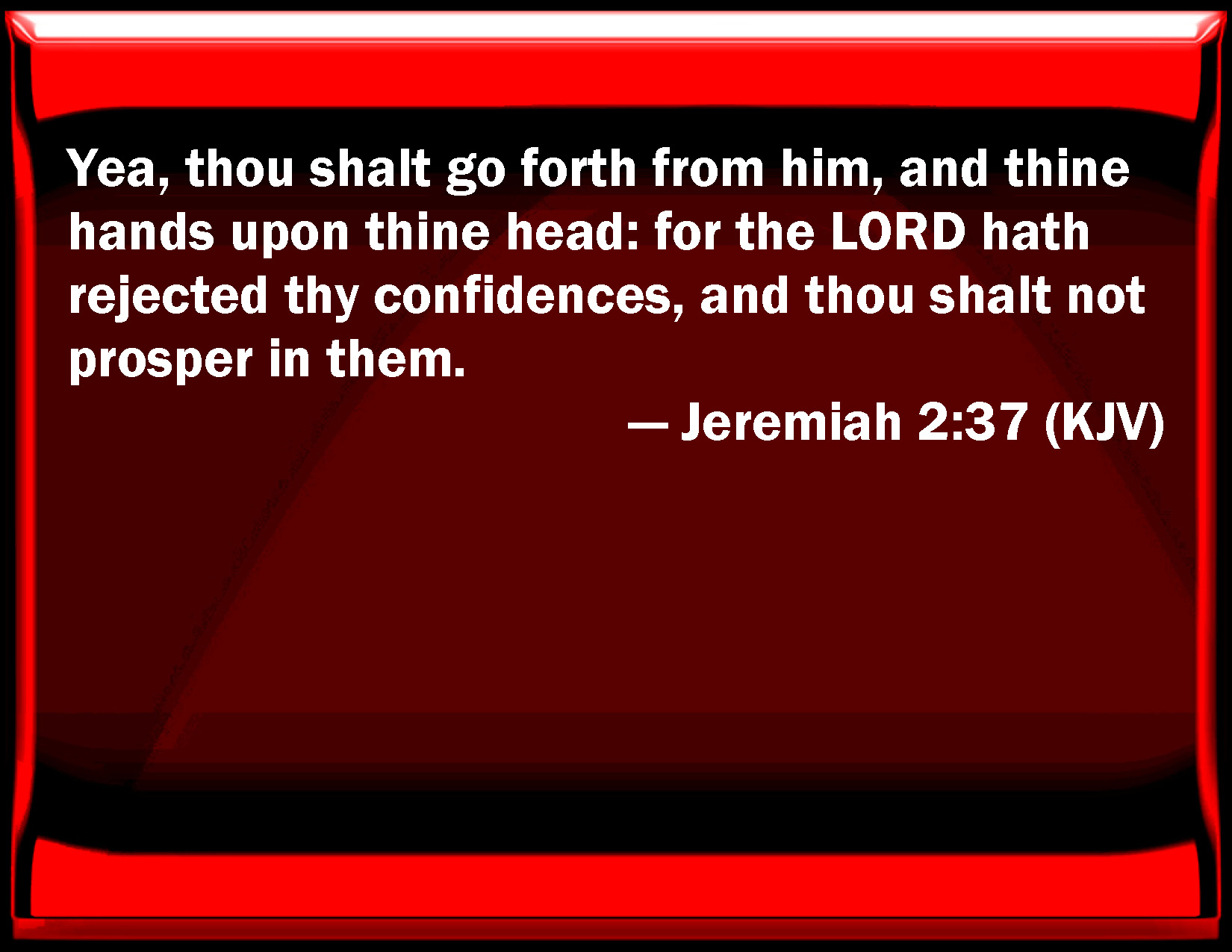 Bible Verse Slide Jeremiah 2:37 Yes, you shall go forth from him, and your hands on your head: for the LORD has rejected your confidences, and you shall not prosper in them. KJV: Yea, thou shalt go forth from him, and thine hands upon thine head: for the LORD hath rejected thy confidences, and thou shalt not prosper in them. DRB: For from thence thou shalt go, and thy hand shall be upon thy head: for the Lord hath destroyed thy trust, and thou shalt have nothing prosperous therein. DBT: Thou shalt indeed go forth from her with thy hands upon thy head; for Jehovah hath rejected those thou confidest in, and thou shalt not prosper by them. ERV: From him also shalt thou go forth, with thine hands upon thine head: for the LORD hath rejected thy confidences, and thou shalt not prosper in them. WBT: Yes, thou shalt go forth from him, and thy hands upon thy head: for the LORD hath rejected thy confidences, and thou shalt not prosper in them. WEB: From there also you shall go forth, with your hands on your head; for Yahweh has rejected those in whom you trust, and you shall not prosper with them. YLT: Also from this thou goest out, And thy hands on thy head, For Jehovah hath kicked at thy confidences, And thou dost not give prosperity to them!Links Jeremiah 2:37 NIV • Jeremiah 2:37 NLT • Jeremiah 2:37 ESV • Jeremiah 2:37 NASB • Jeremiah 2:37 KJV • Jeremiah 2:37 Interlinear • Jeremiah 2:37 Commentaries • Jeremiah 2:37 Parallel Texts • Jeremiah 2:37 Bible Apps • Jeremiah 2:37 Parallel • Bible Hub |