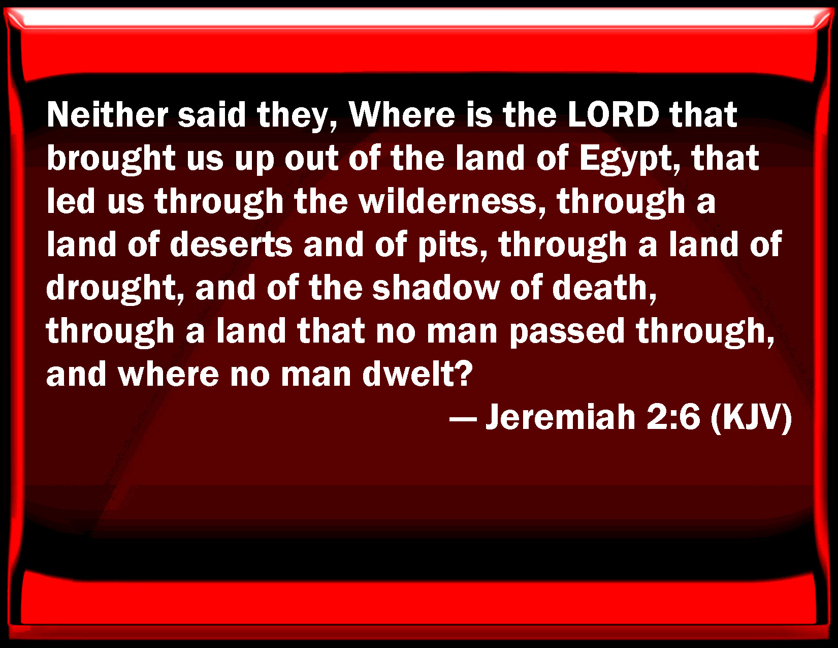 Bible Verse Slide Jeremiah 2:6 Neither said they, Where is the LORD that brought us up out of the land of Egypt, that led us through the wilderness, through a land of deserts and of pits, through a land of drought, and of the shadow of death, through a land that no man passed through, and where no man dwelled? KJV: Neither said they, Where is the LORD that brought us up out of the land of Egypt, that led us through the wilderness, through a land of deserts and of pits, through a land of drought, and of the shadow of death, through a land that no man passed through, and where no man dwelt? DRB: And they have not said: Where is the Lord, that made us come up out of the land of Egypt? that led us through the desert, through a land uninhabited and unpassable, through a land of drought, and the image of death, through a land wherein no man walked, nor any man dwelt? DBT: And they said not, Where is Jehovah, that brought us up out of the land of Egypt, that led us in the wilderness, in a land of deserts and of pits, in a land of drought and of the shadow of death, in a land that no one passeth through, and where no man dwelleth? ERV: Neither said they, Where is the LORD that brought us up out of the land of Egypt; that led us through the wilderness, through a land of deserts and of pits, through a land of drought and of the shadow of death, through a land that none passed through, and where no man dwelt? WBT: Neither said they, Where is the LORD that brought us out of the land of Egypt, that led us through the wilderness, through a land of deserts and of pits, through a land of drouth, and of the shades of death, through a land that no man passed through, and where no man dwelt? WEB: Neither did they say, 'Where is Yahweh who brought us up out of the land of Egypt, who led us through the wilderness, through a land of deserts and of pits, through a land of drought and of the shadow of death, through a land that none passed through, and where no man lived?' YLT: And have not said, Where is Jehovah, Who bringeth us up out of the land of Egypt, Who leadeth us in a wilderness, In a land of deserts and pits, In a dry land, and of death-shade, In a land — none hath passed through it, Nor dwelt hath man there?'Links Jeremiah 2:6 NIV • Jeremiah 2:6 NLT • Jeremiah 2:6 ESV • Jeremiah 2:6 NASB • Jeremiah 2:6 KJV • Jeremiah 2:6 Interlinear • Jeremiah 2:6 Commentaries • Jeremiah 2:6 Parallel Texts • Jeremiah 2:6 Bible Apps • Jeremiah 2:6 Parallel • Bible Hub |