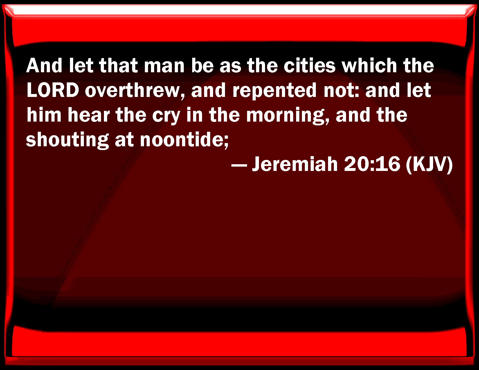 Bible Verse Slide Jeremiah 20:16 And let that man be as the cities which the LORD overthrew, and repented not: and let him hear the cry in the morning, and the shouting at noontide; KJV: And let that man be as the cities which the LORD overthrew, and repented not: and let him hear the cry in the morning, and the shouting at noontide; DRB: Let that man be as the cities that the Lord hath overthrown, and hath not repented: let him hear a cry in the morning, and howling at noontide: DBT: And let that man be as the cities which Jehovah overthrew, and repented not; and let him hear a cry in the morning, and a shouting at noonday, ERV: And let that man be as the cities which the LORD overthrew, and repented not: and let him hear a cry in the morning, and shouting at noontide; WBT: And let that man be as the cities which the LORD overthrew, and repented not: and let him hear the cry in the morning, and the shouting at noon; WEB: Let that man be as the cities which Yahweh overthrew, and didn't repent: and let him hear a cry in the morning, and shouting at noontime; YLT: Then hath that man been as the cities, That Jehovah overthrew, and repented not, And he hath heard a cry at morning, And a shout at time of noon.Links Jeremiah 20:16 NIV • Jeremiah 20:16 NLT • Jeremiah 20:16 ESV • Jeremiah 20:16 NASB • Jeremiah 20:16 KJV • Jeremiah 20:16 Interlinear • Jeremiah 20:16 Commentaries • Jeremiah 20:16 Parallel Texts • Jeremiah 20:16 Bible Apps • Jeremiah 20:16 Parallel • Bible Hub |