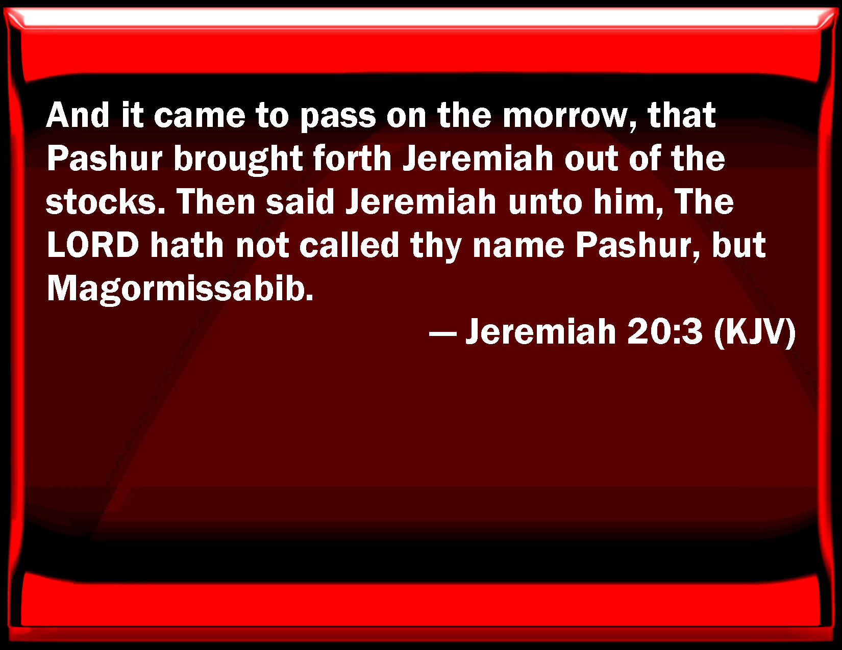 Bible Verse Slide Jeremiah 20:3 And it came to pass on the morrow, that Pashur brought forth Jeremiah out of the stocks. Then said Jeremiah to him, The LORD has not called your name Pashur, but Magormissabib. KJV: And it came to pass on the morrow, that Pashur brought forth Jeremiah out of the stocks. Then said Jeremiah unto him, The LORD hath not called thy name Pashur, but Magormissabib. DRB: And when it was light the next day, Phassur brought Jeremias out of the stocks. And Jeremias said to him: The Lord hath not called thy name Phassur, but fear on every side. DBT: And it came to pass the next day, that Pashur brought forth Jeremiah out of the stocks; and Jeremiah said unto him, Jehovah hath not called thy name Pashur, but Magor-missabib. ERV: And it came to pass on the morrow, that Pashhur brought forth Jeremiah out of the stocks. Then said Jeremiah unto him, The LORD hath not called thy name Pashhur, but Magor-missabib. WBT: And it came to pass on the morrow, that Pashur brought forth Jeremiah out of the stocks. Then said Jeremiah to him, The LORD hath not called thy name Pashur, but Magor-missabib. WEB: It happened on the next day, that Pashhur brought forth Jeremiah out of the stocks. Then Jeremiah said to him, Yahweh has not called your name Pashhur, but Magormissabib. YLT: and it cometh to pass on the morrow, that Pashhur bringeth out Jeremiah from the stocks, and Jeremiah saith unto him, 'Not Pashhur hath Jehovah called thy name, but — Magor-Missabib.Links Jeremiah 20:3 NIV • Jeremiah 20:3 NLT • Jeremiah 20:3 ESV • Jeremiah 20:3 NASB • Jeremiah 20:3 KJV • Jeremiah 20:3 Interlinear • Jeremiah 20:3 Commentaries • Jeremiah 20:3 Parallel Texts • Jeremiah 20:3 Bible Apps • Jeremiah 20:3 Parallel • Bible Hub |