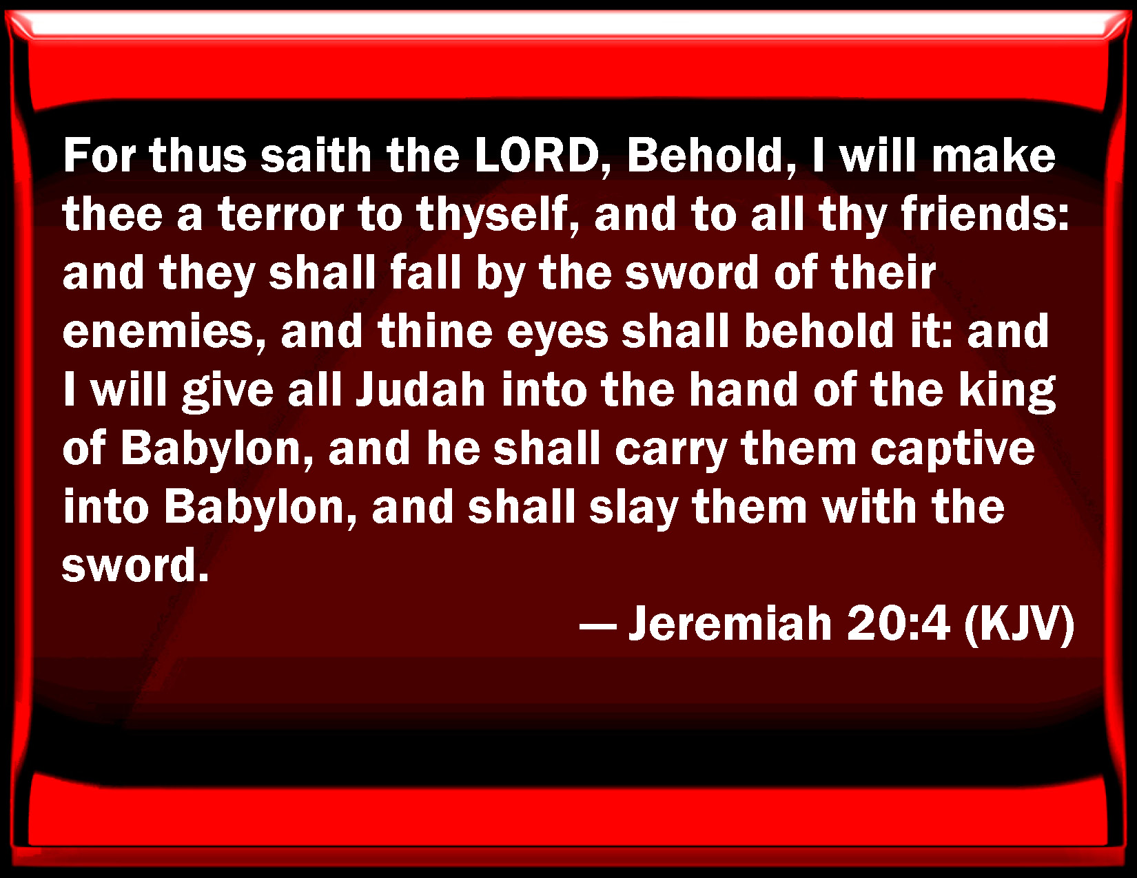 Bible Verse Slide Jeremiah 20:4 For thus said the LORD, Behold, I will make you a terror to yourself, and to all your friends: and they shall fall by the sword of their enemies, and your eyes shall behold it: and I will give all Judah into the hand of the king of Babylon, and he shall carry them captive into Babylon, and shall slay them with the sword. KJV: For thus saith the LORD, Behold, I will make thee a terror to thyself, and to all thy friends: and they shall fall by the sword of their enemies, and thine eyes shall behold it: and I will give all Judah into the hand of the king of Babylon, and he shall carry them captive into Babylon, and shall slay them with the sword. DRB: For thus saith the Lord: Behold I will deliver thee up to fear, thee and all thy friends: and they shall fall by the sword of their enemies, and thy eyes shall see it, and I will give all Juda into the hand of the king of Babylon: and he shall strike them with the sword. DBT: For thus saith Jehovah: Behold, I make thee a terror to thyself, and to all thy friends; and they shall fall by the sword of their enemies, and thine eyes shall see it; and I will give all Judah into the hand of the king of Babylon, and he shall carry them captive into Babylon, and shall smite them with the sword. ERV: For thus saith the LORD, Behold, I will make thee a terror to thyself, and to all thy friends: and they shall fall by the sword of their enemies, and thine eyes shall behold it: and I will give all Judah into the hand of the king of Babylon, and he shall carry them captive to Babylon, and shall slay them with the sword. WBT: For thus saith the LORD, Behold, I will make thee a terror to thyself, and to all thy friends: and they shall fall by the sword of their enemies, and thy eyes shall behold it: and I will give all Judah into the hand of the king of Babylon, and he shall carry them captive into Babylon, and shall slay them with the sword. WEB: For thus says Yahweh, Behold, I will make you a terror to yourself, and to all your friends; and they shall fall by the sword of their enemies, and your eyes shall see it; and I will give all Judah into the hand of the king of Babylon, and he shall carry them captive to Babylon, and shall kill them with the sword. YLT: For thus said Jehovah: Lo, I am making thee for a fear to thyself, And to all loving thee, And they have fallen by the sword of their enemies, and thine eyes are beholding, And all Judah I give into the hand of the king of Babylon, And he hath removed them to Babylon, And he hath smitten them with the sword.Links Jeremiah 20:4 NIV • Jeremiah 20:4 NLT • Jeremiah 20:4 ESV • Jeremiah 20:4 NASB • Jeremiah 20:4 KJV • Jeremiah 20:4 Interlinear • Jeremiah 20:4 Commentaries • Jeremiah 20:4 Parallel Texts • Jeremiah 20:4 Bible Apps • Jeremiah 20:4 Parallel • Bible Hub |