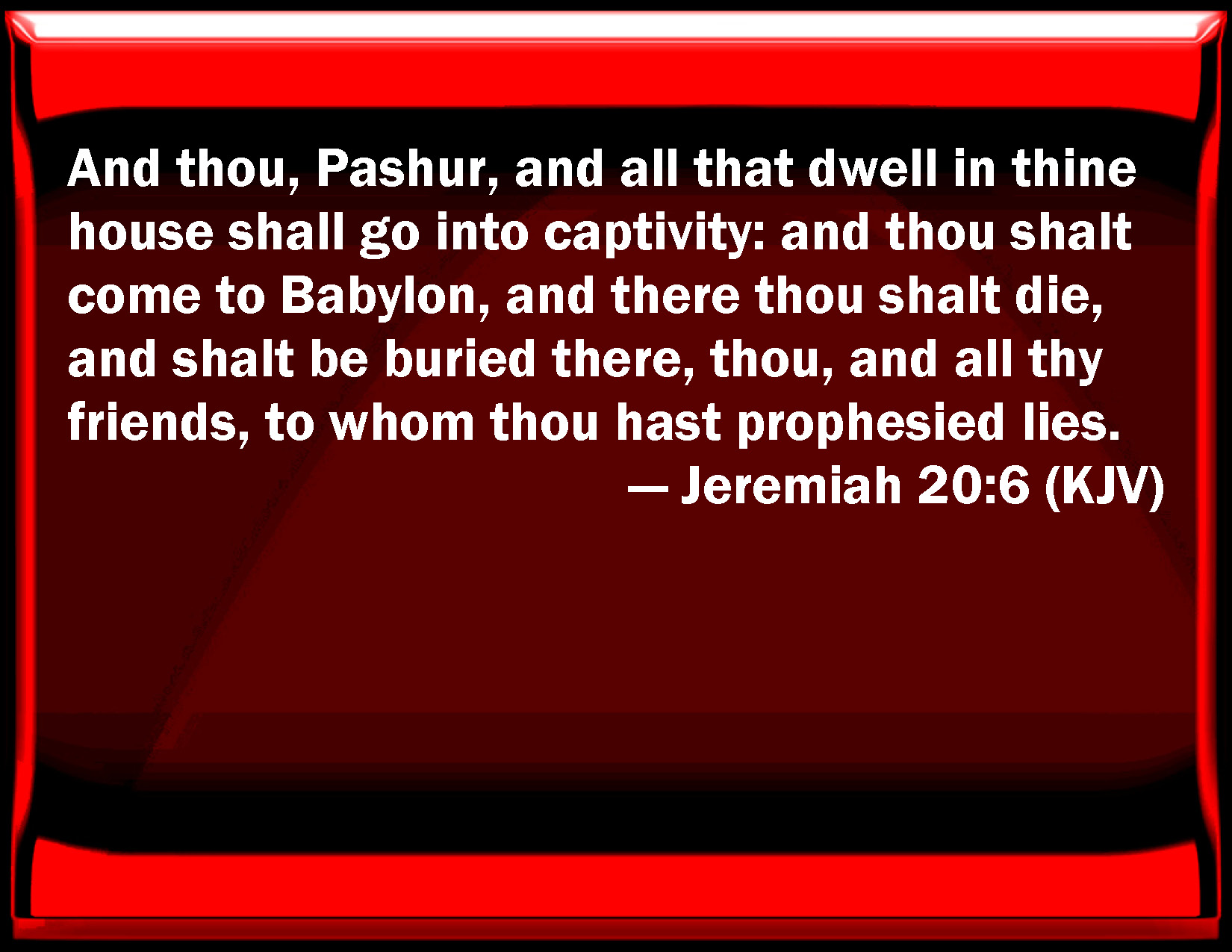 Bible Verse Slide Jeremiah 20:6 And you, Pashur, and all that dwell in your house shall go into captivity: and you shall come to Babylon, and there you shall die, and shall be buried there, you, and all your friends, to whom you have prophesied lies. KJV: And thou, Pashur, and all that dwell in thine house shall go into captivity: and thou shalt come to Babylon, and there thou shalt die, and shalt be buried there, thou, and all thy friends, to whom thou hast prophesied lies. DRB: But thou, Phassur, and all that dwell in thy house, shall go into captivity, and thou shalt go to Babylon, and there thou shalt die, and there thou shalt be buried, thou and all thy friends, to whom thou hast prophesied a lie. DBT: And thou, Pashur, and all that dwell in thy house shall go into captivity; and thou shalt come to Babylon, and there thou shalt die, and there thou shalt be buried, thou and all thy friends to whom thou hast prophesied falsehood. ERV: And thou, Pashhur, and all that dwell in thine house shall go into captivity: and thou shalt come to Babylon, and there thou shalt die, and there shalt thou be buried, thou, and all thy friends, to whom thou hast prophesied falsely. WBT: And thou, Pashur, and all that dwell in thy house shall go into captivity: and thou shalt come to Babylon, and there thou shalt die, and shalt be buried there, thou, and all thy friends, to whom thou hast prophesied lies. WEB: You, Pashhur, and all who dwell in your house shall go into captivity; and you shall come to Babylon, and there you shall die, and there you shall be buried, you, and all your friends, to whom you have prophesied falsely. YLT: And thou, Pashhur, and all dwelling in thy house, Do go into captivity. and Babylon thou dost enter, And there thou diest, and there thou art buried, Thou and all loving thee, To whom thou hast prophesied falsely.'Links Jeremiah 20:6 NIV • Jeremiah 20:6 NLT • Jeremiah 20:6 ESV • Jeremiah 20:6 NASB • Jeremiah 20:6 KJV • Jeremiah 20:6 Interlinear • Jeremiah 20:6 Commentaries • Jeremiah 20:6 Parallel Texts • Jeremiah 20:6 Bible Apps • Jeremiah 20:6 Parallel • Bible Hub |