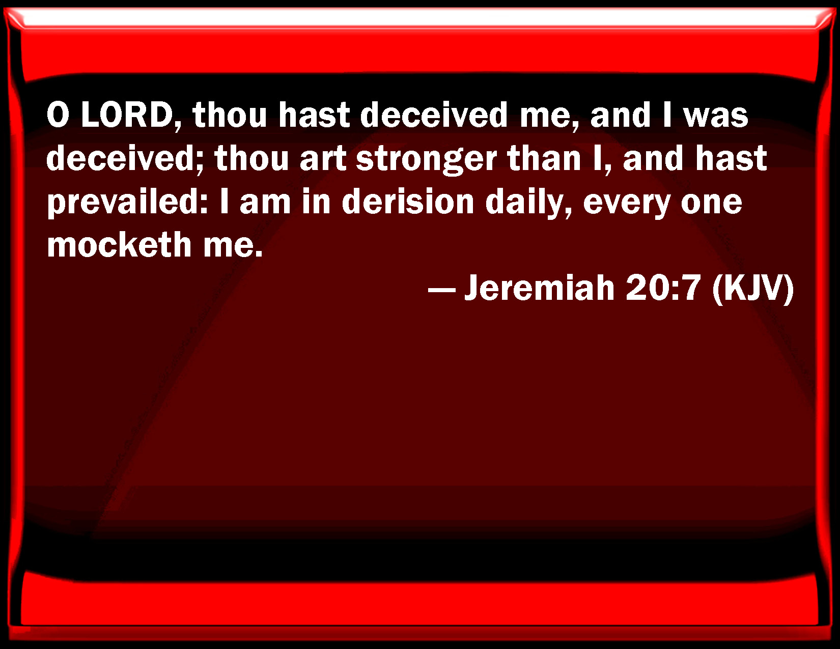 Bible Verse Slide Jeremiah 20:7 O LORD, you have deceived me, and I was deceived; you are stronger than I, and have prevailed: I am in derision daily, every one mocks me. KJV: O LORD, thou hast deceived me, and I was deceived: thou art stronger than I, and hast prevailed: I am in derision daily, every one mocketh me. DRB: Thou hast deceived me, O Lord, and I am deceived: thou hast been stronger than I, and thou hast prevailed. I am become a laughing-stock all the day, all scoff at me. DBT: Jehovah, thou hast enticed me, and I was enticed; thou hast laid hold of me, and hast prevailed; I am become a derision the whole day: every one mocketh me. ERV: O LORD, thou hast deceived me, and I was deceived: thou art stronger than I, and hast prevailed: I am become a laughingstock all the day, every one mocketh me. WBT: O LORD, thou hast deceived me, and I was deceived: thou art stronger than I, and hast prevailed: I am in derision daily, every one mocketh me. WEB: Yahweh, you have persuaded me, and I was persuaded; you are stronger than I, and have prevailed: I am become a laughing-stock all the day, every one mocks me. YLT: Thou hast persuaded me, O Jehovah, and I am persuaded; Thou hast hardened me, and dost prevail, I have been for a laughter all the day, Every one is mocking at me,Links Jeremiah 20:7 NIV • Jeremiah 20:7 NLT • Jeremiah 20:7 ESV • Jeremiah 20:7 NASB • Jeremiah 20:7 KJV • Jeremiah 20:7 Interlinear • Jeremiah 20:7 Commentaries • Jeremiah 20:7 Parallel Texts • Jeremiah 20:7 Bible Apps • Jeremiah 20:7 Parallel • Bible Hub |
