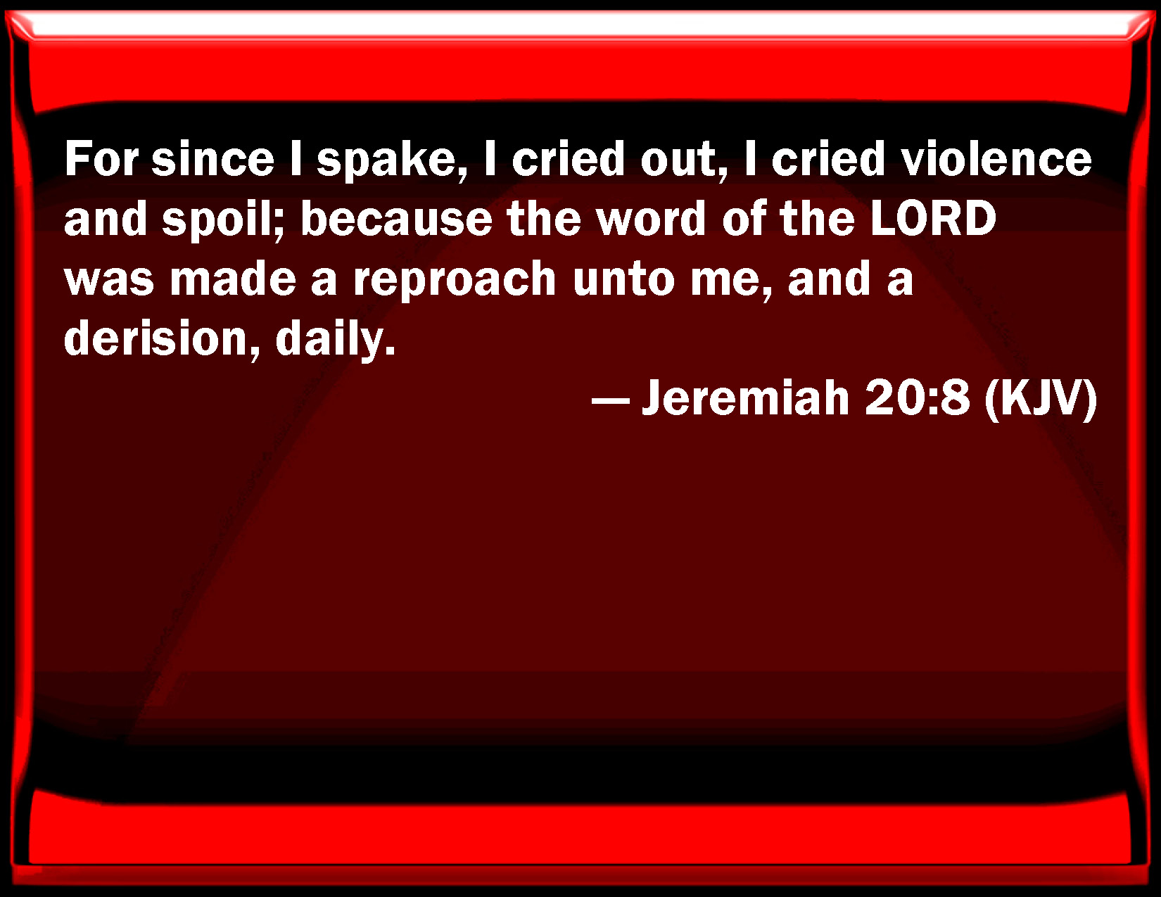 Bible Verse Slide Jeremiah 20:8 For since I spoke, I cried out, I cried violence and spoil; because the word of the LORD was made a reproach to me, and a derision, daily. KJV: For since I spake, I cried out, I cried violence and spoil; because the word of the LORD was made a reproach unto me, and a derision, daily. DRB: For I am speaking now this long time, crying out against iniquity, and I often proclaim devistation: and the word of the Lord is made a reproach to me, and a derision all the day. DBT: For as oft as I speak, I cry out; I proclaim violence and spoil; for the word of Jehovah is become unto me a reproach and a derision all the day. ERV: For as often as I speak, I cry out; I cry, Violence and spoil: because the word of the LORD is made a reproach unto me, and a derision, all the day. WBT: For since I spoke, I cried out, I cried violence and spoil; because the word of the LORD was made a reproach to me, and a derision, daily. WEB: For as often as I speak, I cry out; I cry, Violence and destruction! because the word of Yahweh is made a reproach to me, and a derision, all the day. YLT: Because from the time I speak I cry out, 'Violence and destruction,' I cry, For the word of Jehovah hath been to me For reproach and for derision all the day.Links Jeremiah 20:8 NIV • Jeremiah 20:8 NLT • Jeremiah 20:8 ESV • Jeremiah 20:8 NASB • Jeremiah 20:8 KJV • Jeremiah 20:8 Interlinear • Jeremiah 20:8 Commentaries • Jeremiah 20:8 Parallel Texts • Jeremiah 20:8 Bible Apps • Jeremiah 20:8 Parallel • Bible Hub |
