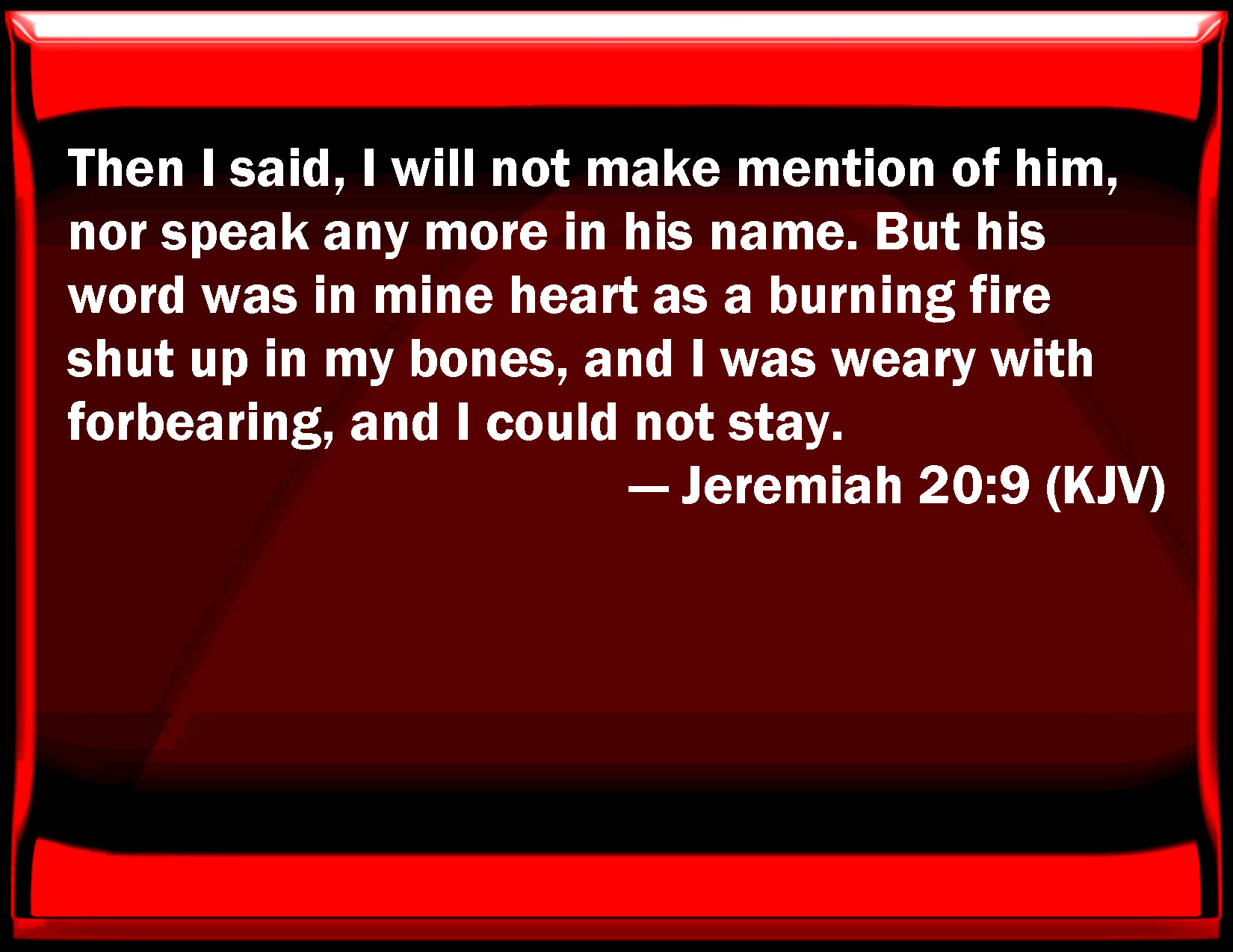 Bible Verse Slide Jeremiah 20:9 Then I said, I will not make mention of him, nor speak any more in his name. But his word was in my heart as a burning fire shut up in my bones, and I was weary with forbearing, and I could not stay. KJV: Then I said, I will not make mention of him, nor speak any more in his name. But his word was in mine heart as a burning fire shut up in my bones, and I was weary with forbearing, and I could not stay. DRB: Then I said: I will not make mention of him, nor speak any more in his name: and there came in my heart as a burning fire shut up in my bones, and I was wearied, not being able to bear it. DBT: And I said, I will not make mention of him, nor speak any more in his name: but it was in my heart as a burning fire shut up in my bones; and I became wearied with holding in, and I could not. ERV: And if I say, I will not make mention of him, nor speak any more in his name, then there is in mine heart as it were a burning fire shut up in my bones, and I am weary with forbearing, and I cannot contain. WBT: Then I said, I will not make mention of him, nor speak any more in his name. But his word was in my heart as a burning fire shut up in my bones, and I was weary with forbearing, and I could not stay. WEB: If I say, I will not make mention of him, nor speak any more in his name, then there is in my heart as it were a burning fire shut up in my bones, and I am weary with forbearing, and I can't [contain]. YLT: And I said, 'I do not mention Him, Nor do I speak any more in His name,' And it hath been in my heart As a burning fire shut up in my bones, And I have been weary of containing, And I am not able.Links Jeremiah 20:9 NIV • Jeremiah 20:9 NLT • Jeremiah 20:9 ESV • Jeremiah 20:9 NASB • Jeremiah 20:9 KJV • Jeremiah 20:9 Interlinear • Jeremiah 20:9 Commentaries • Jeremiah 20:9 Parallel Texts • Jeremiah 20:9 Bible Apps • Jeremiah 20:9 Parallel • Bible Hub |