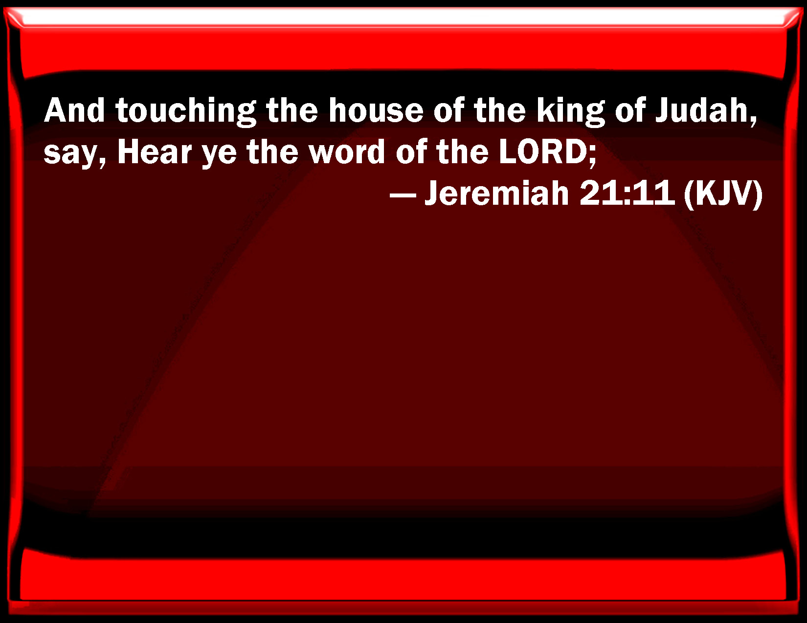 Bible Verse Slide Jeremiah 21:11 And touching the house of the king of Judah, say, Hear you the word of the LORD; KJV: And touching the house of the king of Judah, say, Hear ye the word of the LORD; DRB: And to the house of the king of Juda: Hear ye the word of the Lord, DBT: And touching the house of the king of Judah, hear ye the word of Jehovah. ERV: And touching the house of the king of Judah, hear ye the word of the LORD: WBT: And concerning the house of the king of Judah, say, Hear ye the word of the LORD; WEB: Touching the house of the king of Judah, hear the word of Yahweh: YLT: And as to the house of the king of Judah, Hear ye a word of Jehovah;Links Jeremiah 21:11 NIV • Jeremiah 21:11 NLT • Jeremiah 21:11 ESV • Jeremiah 21:11 NASB • Jeremiah 21:11 KJV • Jeremiah 21:11 Interlinear • Jeremiah 21:11 Commentaries • Jeremiah 21:11 Parallel Texts • Jeremiah 21:11 Bible Apps • Jeremiah 21:11 Parallel • Bible Hub |
